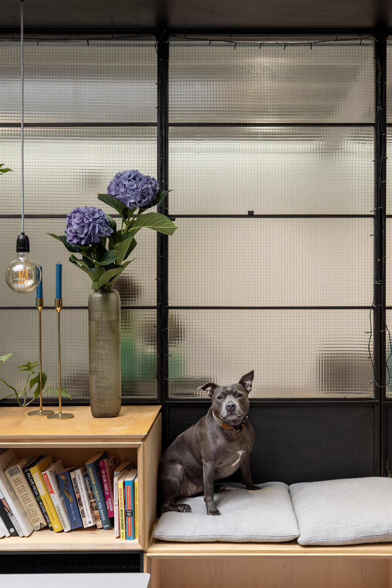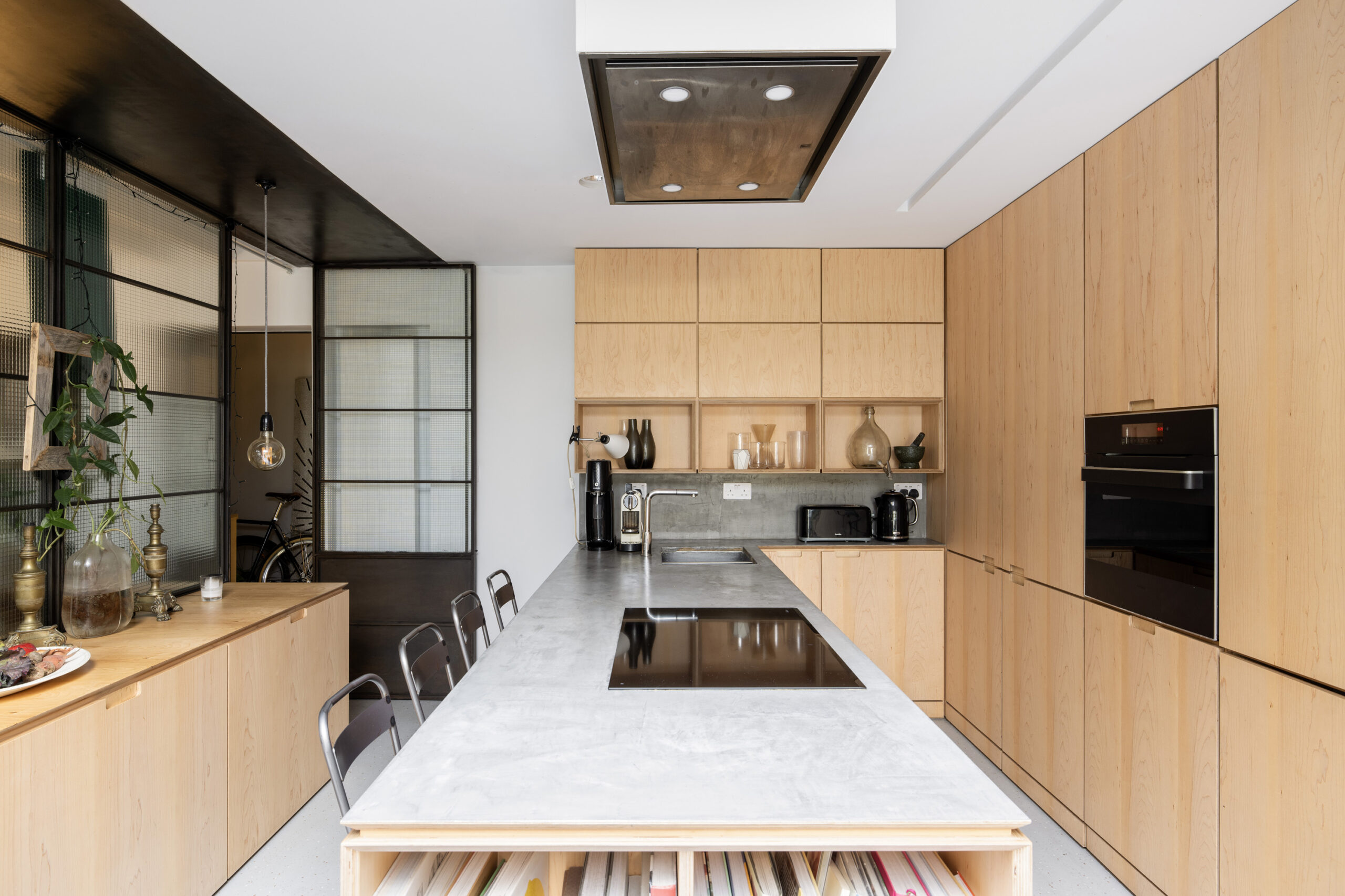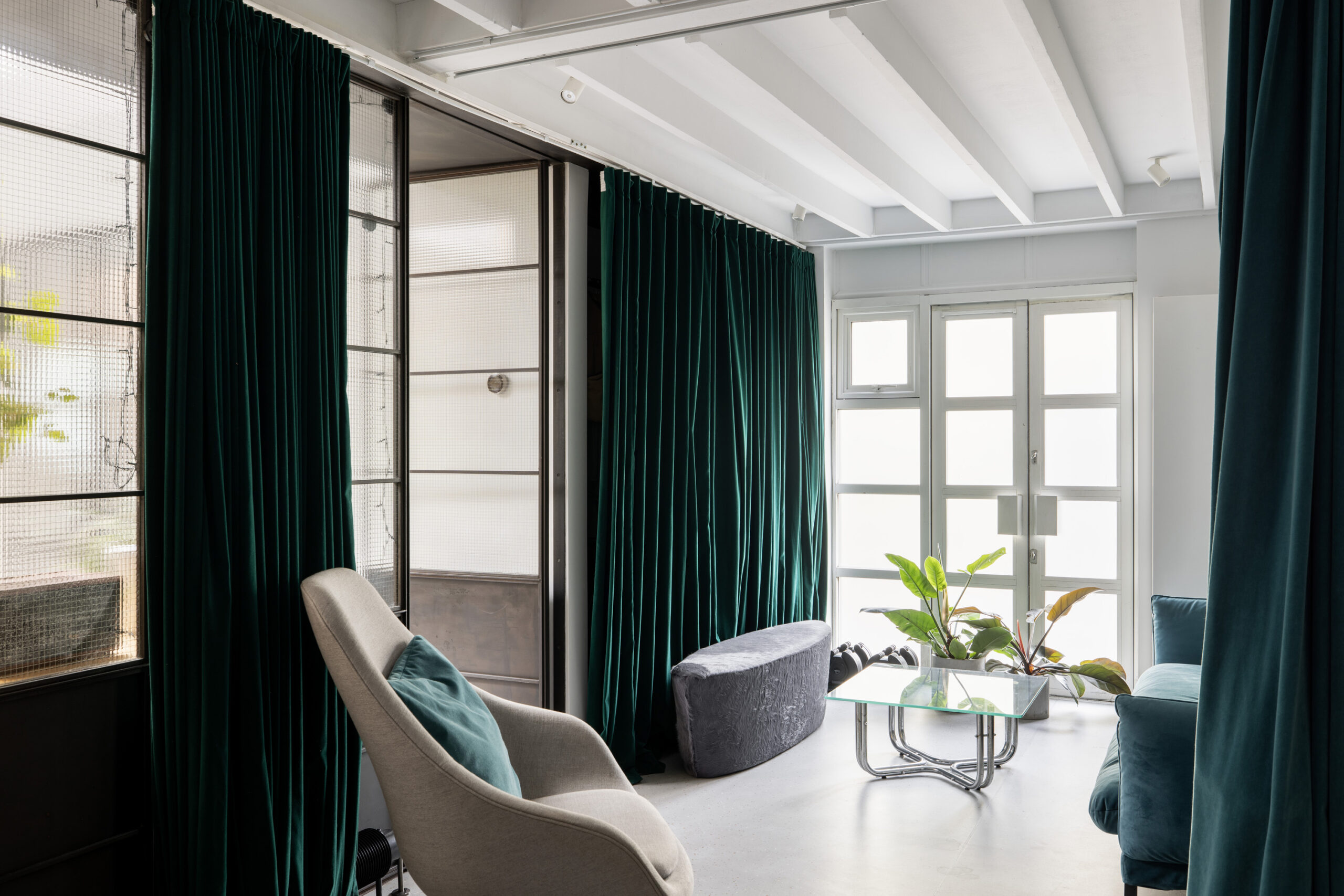 There are two floors in total, spanning approximately 1662 sqft of dynamic, open-plan living space. Beneath a double-height atrium, the ground-floor kitchen diner integrates rich, natural materials and retro decor to tame a startlingly expansive industrial space. The kitchen is a masterwork of softwood, j-trim cabinetry that feels seductively 70’s in its minimalism and rusticity. Statement crittall doors separate the space from the neighbouring reception room, using textured glass to subtly diffuse the warm, ambient lighting. It is a sweeping, lateral space, where the current owners have deployed plush, voluminous curtains in teal velvet to warm and comfort. Tucked behind the kitchen, is a discreet space containing the pantry, utility room, downstairs shower room and a rear door to the private car park where there is one gated parking space.