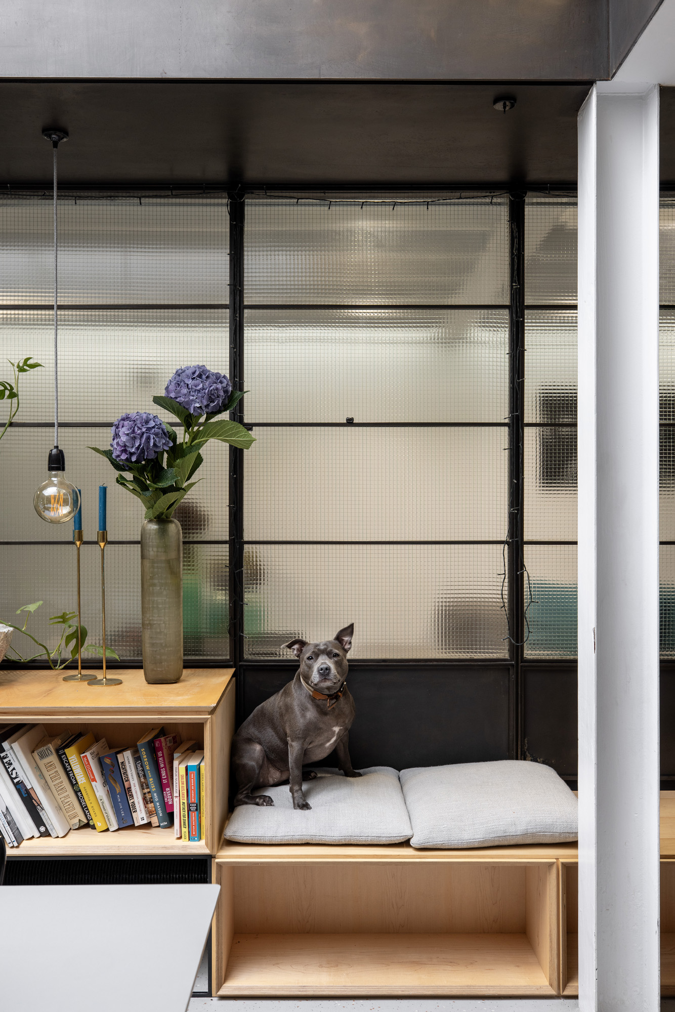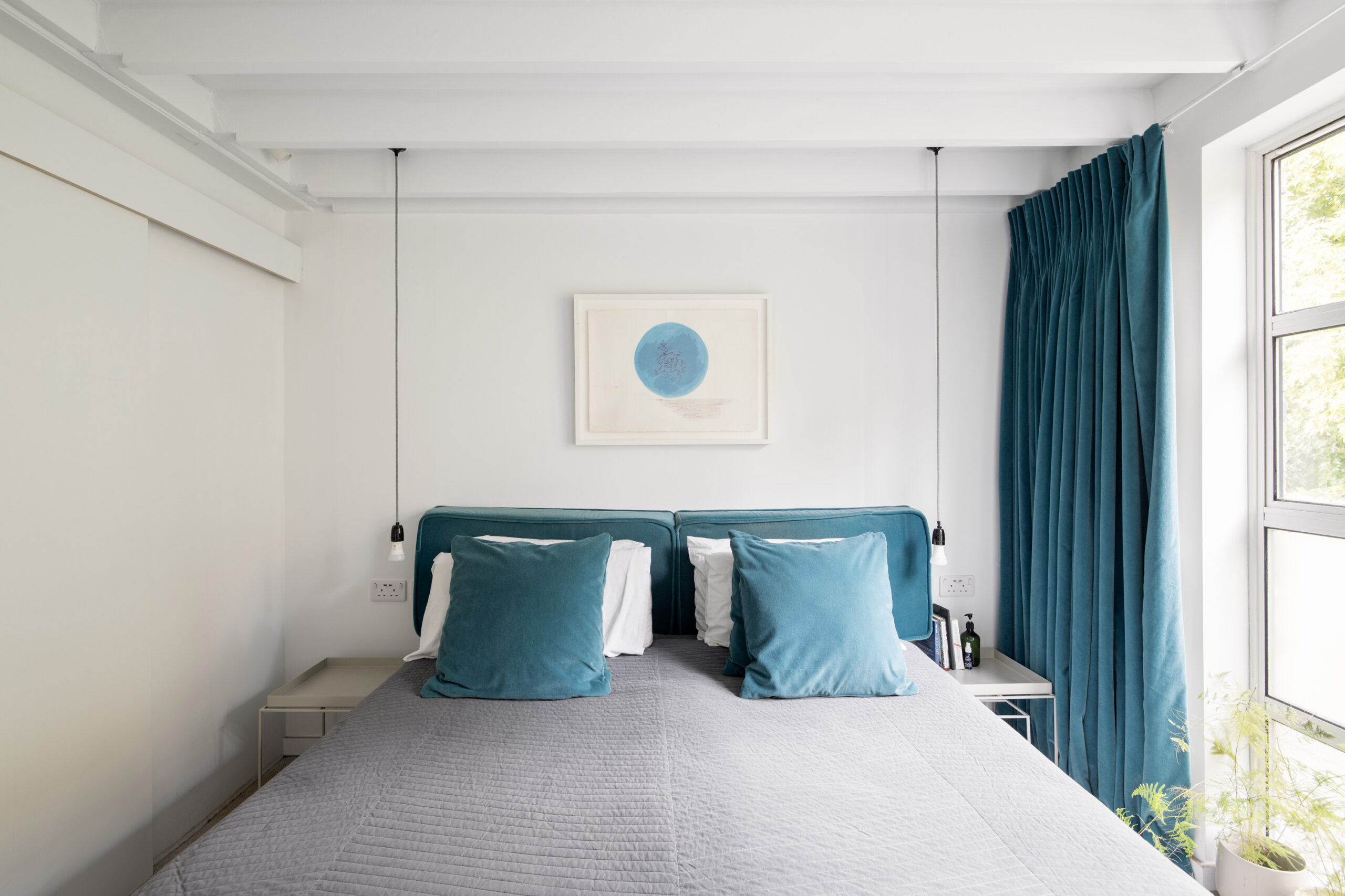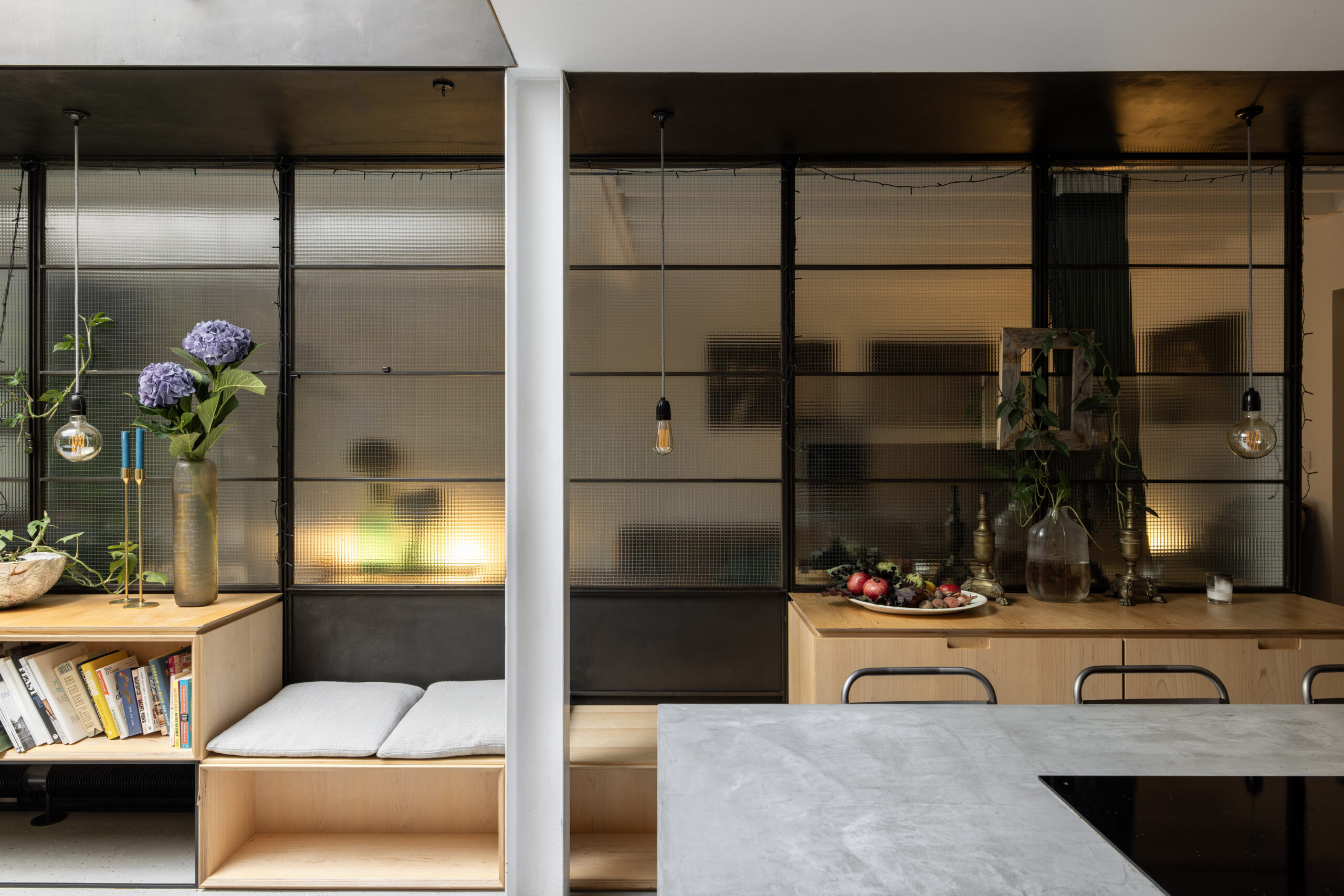 There are two floors in total, spanning approximately 1662 sqft of dynamic, open-plan living space. Beneath a double-height atrium, the ground-floor kitchen diner integrates rich, natural materials and retro decor to tame a startlingly expansive industrial space. The kitchen is a masterwork of softwood, j-trim cabinetry that feels seductively 70’s in its minimalism and rusticity. Statement crittall doors separate the space from the neighbouring reception room, using textured glass to subtly diffuse the warm, ambient lighting. It is a sweeping, lateral space, where the current owners have deployed plush, voluminous curtains in teal velvet to warm and comfort. Tucked behind the kitchen, is a discreet space containing the pantry, utility room, downstairs shower room and a rear door to the private car park where there is one gated parking space.