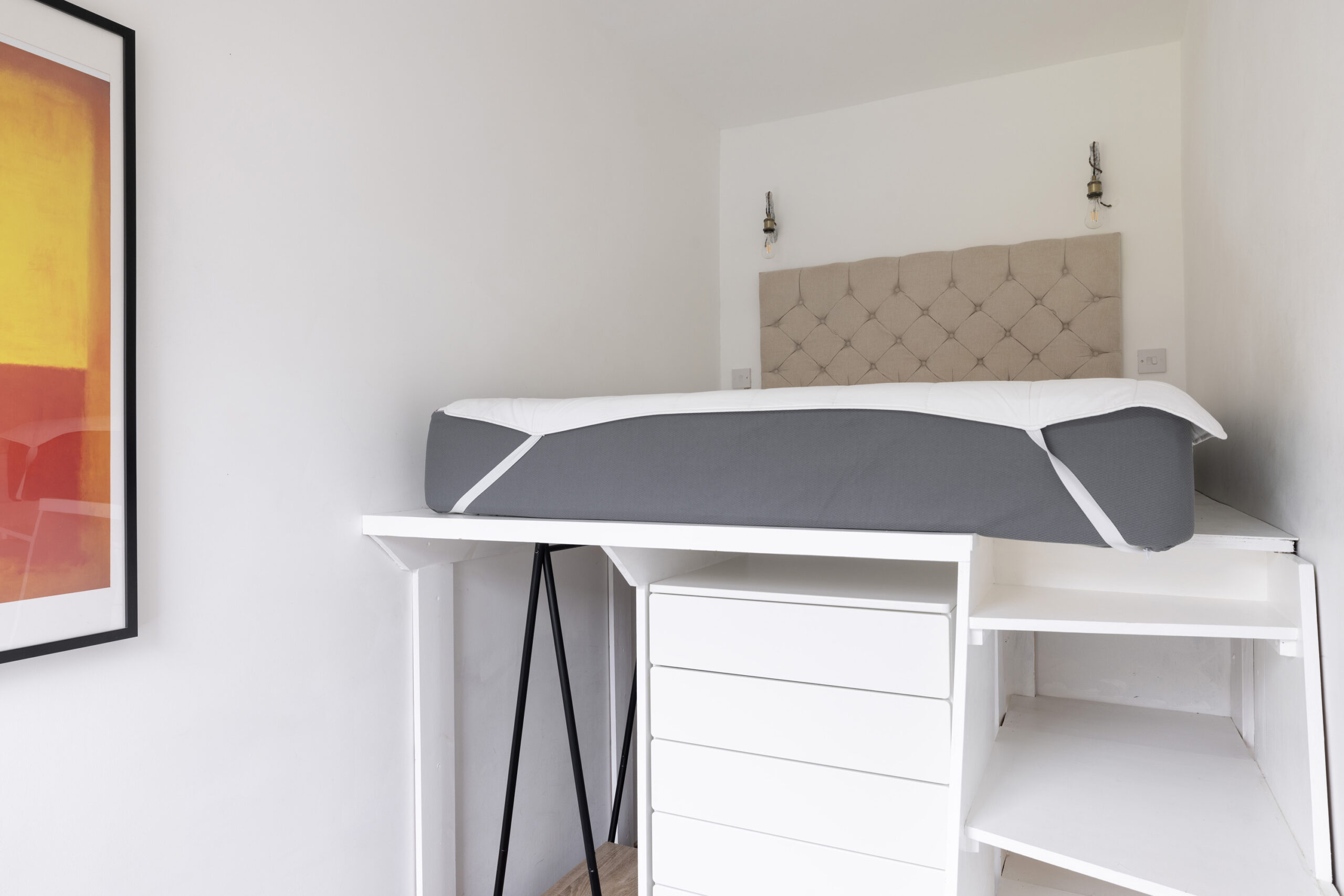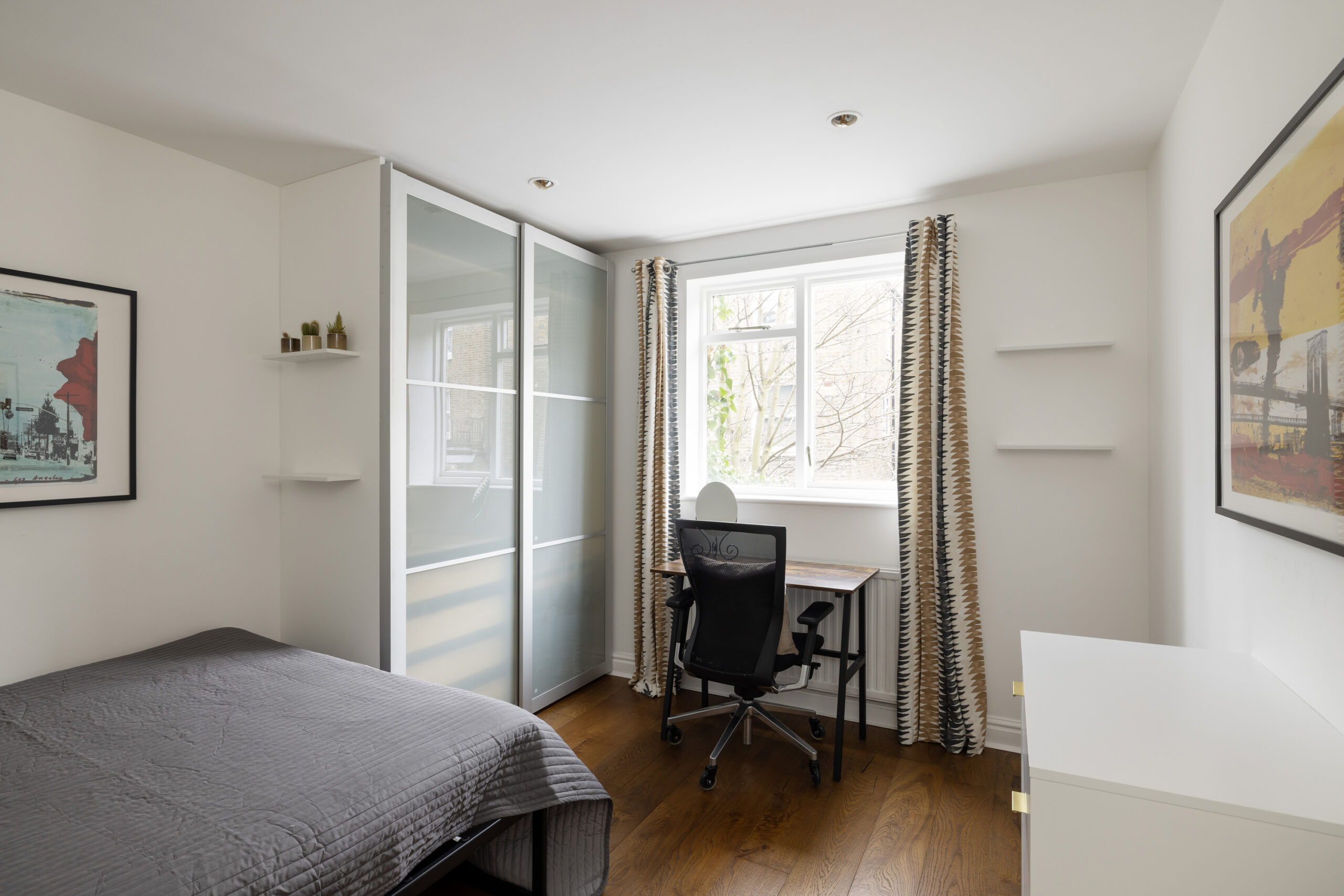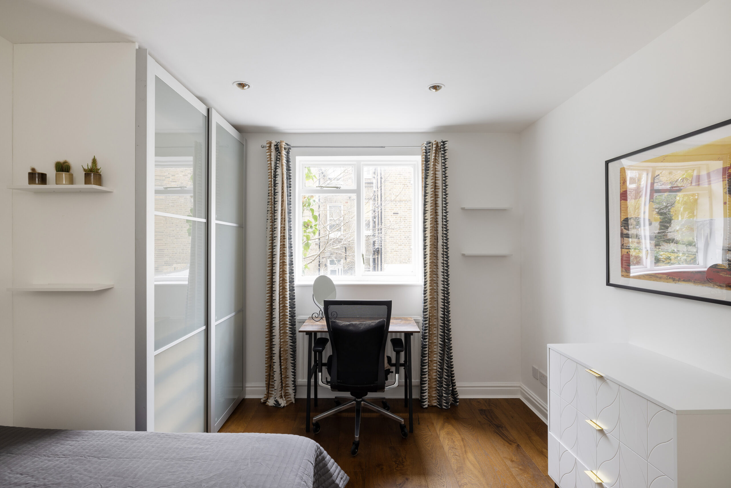 The secondary bedroom adjoins the reception room. It’s a functional, innovative room that inserts an abundance of storage beneath a tiered double bed. It’s worth noting here that this apartment may be best suited to a young professional couple who could use the spare bedroom as an office or sleeping nook for guests. On the lower level is the main bedroom, overlooking tranquil gardens at the rear of the property. Storage is abundant throughout the apartment, but here it is particularly impressive with large, sliding glass fitted wardrobes. Finally, a white-tiled bathroom glimmers against dressing room-esque lights. The apartment borders Maida Vale and Queen’s Park and sits on a quiet tree lined street.