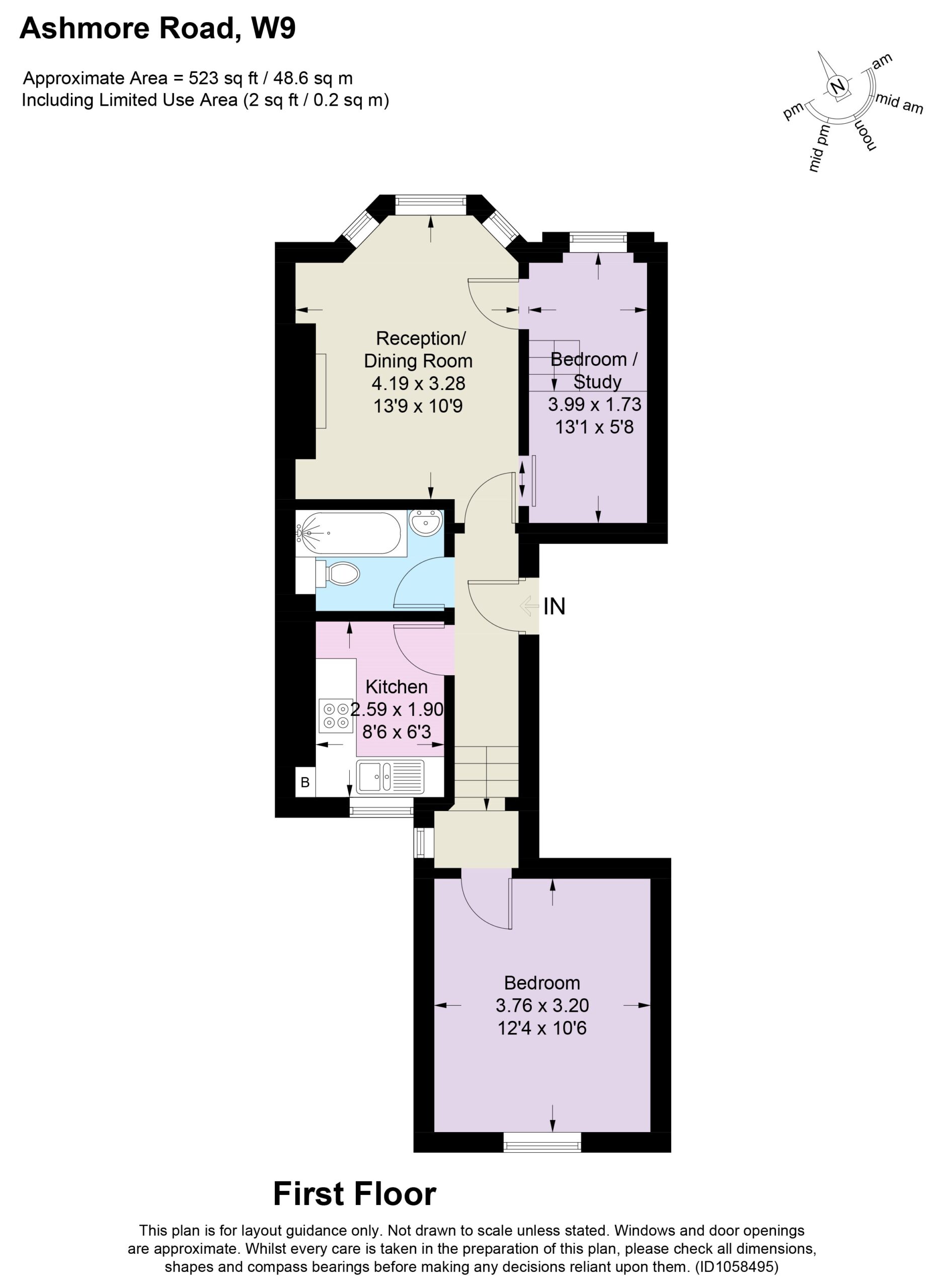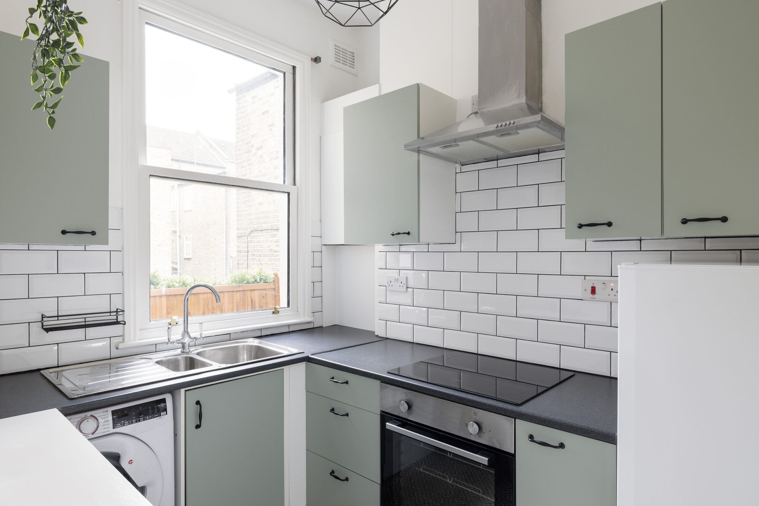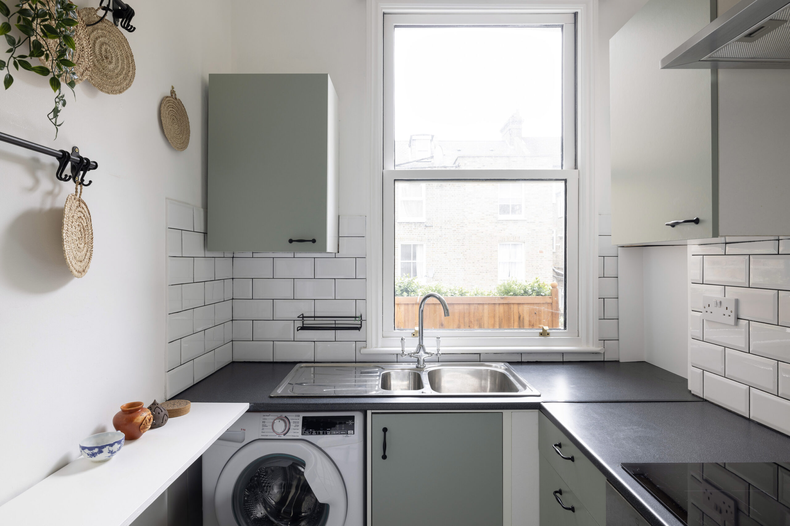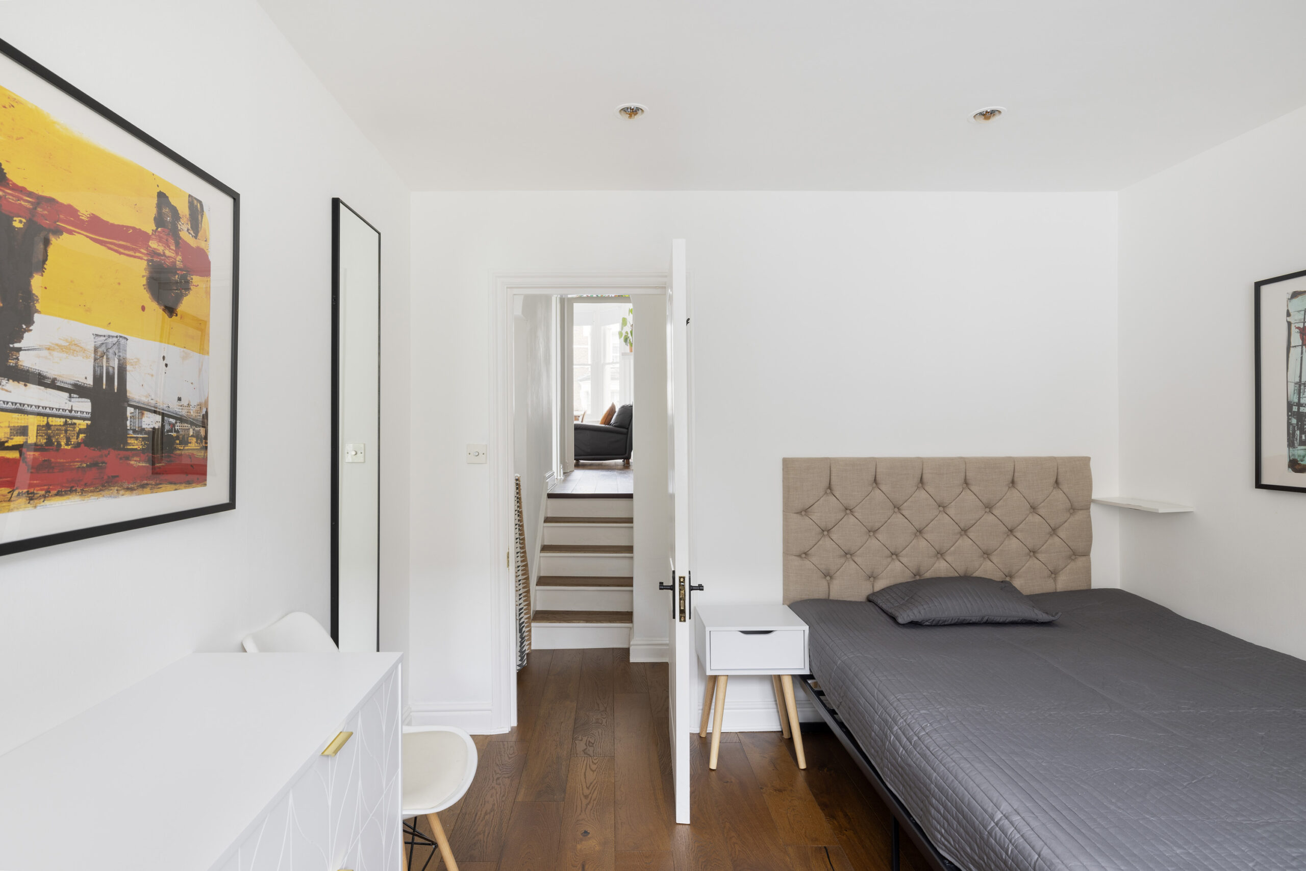 The secondary bedroom adjoins the reception room. It’s a functional, innovative room that inserts an abundance of storage beneath a tiered double bed. It’s worth noting here that this apartment may be best suited to a young professional couple who could use the spare bedroom as an office or sleeping nook for guests. On the lower level is the main bedroom, overlooking tranquil gardens at the rear of the property. Storage is abundant throughout the apartment, but here it is particularly impressive with large, sliding glass fitted wardrobes. Finally, a white-tiled bathroom glimmers against dressing room-esque lights. The apartment borders Maida Vale and Queen’s Park and sits on a quiet tree lined street.