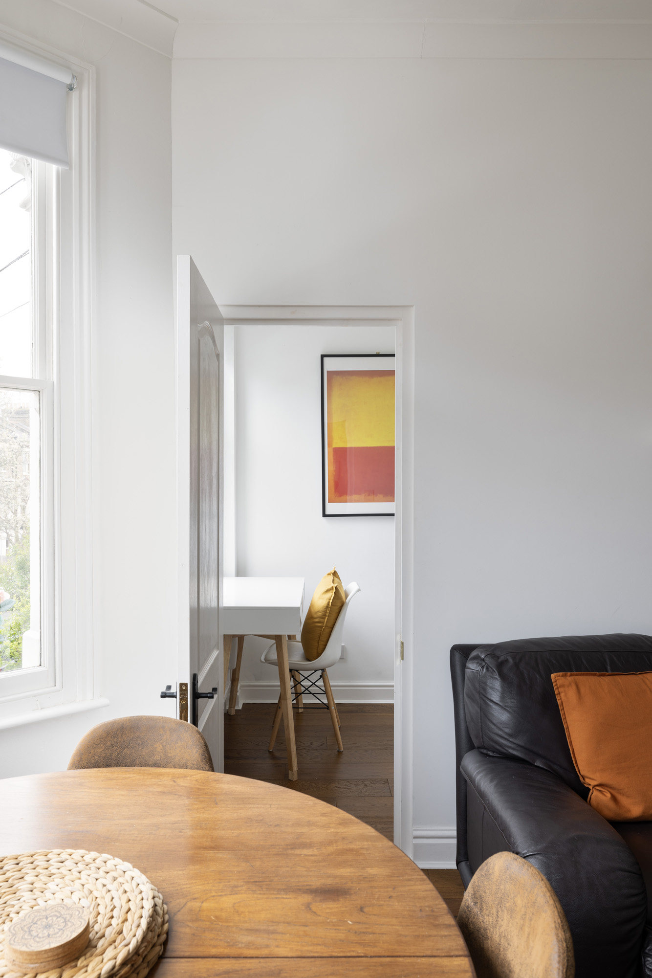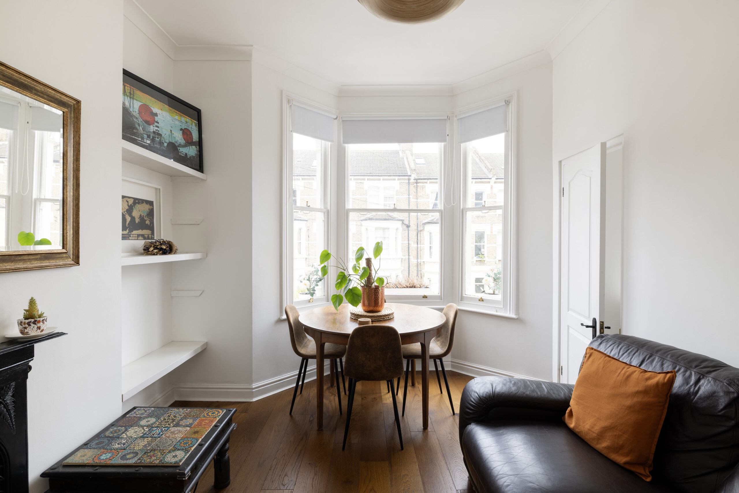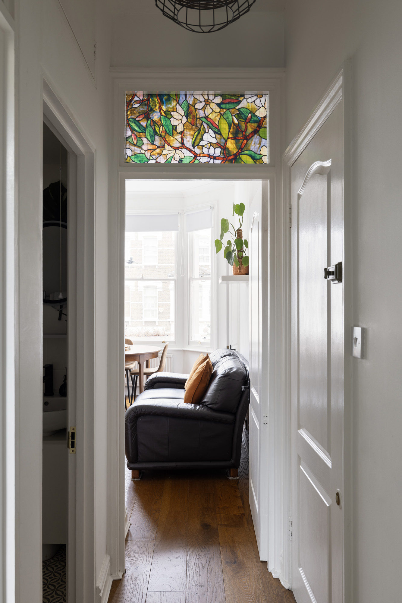 A floral stained glass mural crowns the entrance to the reception room, working in tandem with the dark, soil-brown wood floors. The reception room is cosy, with high ceilings, original bay windows and a bituminous period fireplace that begs to be admired.