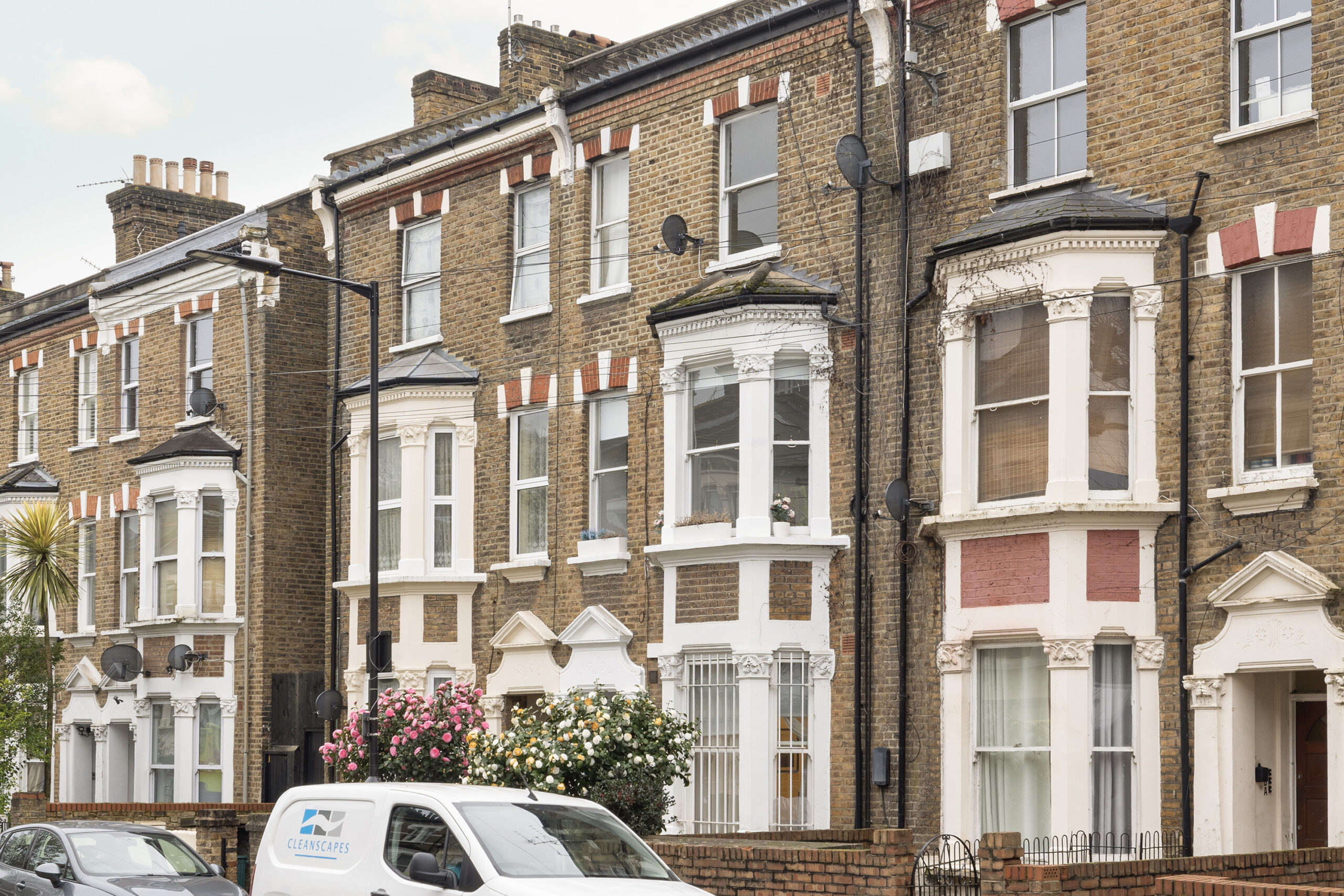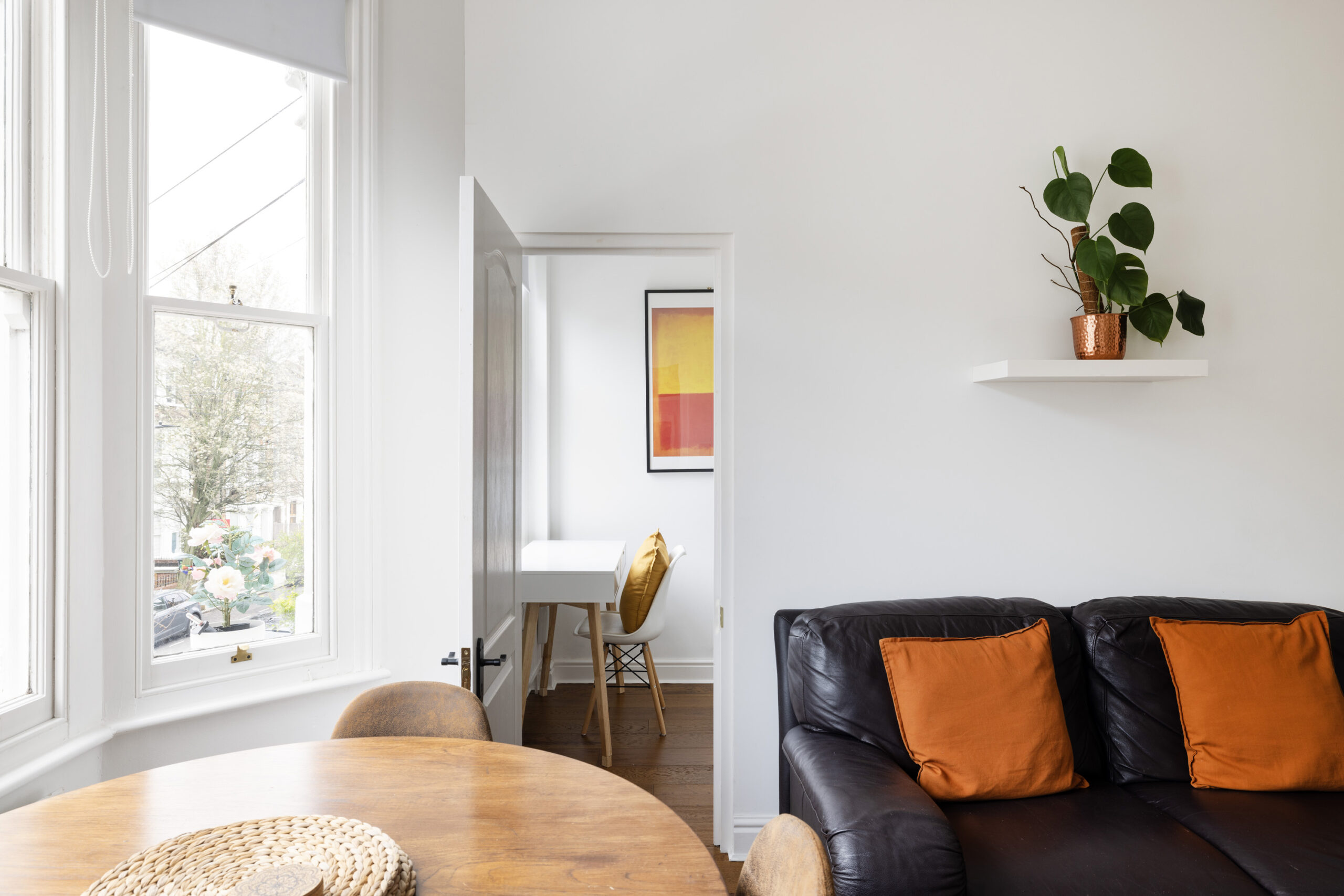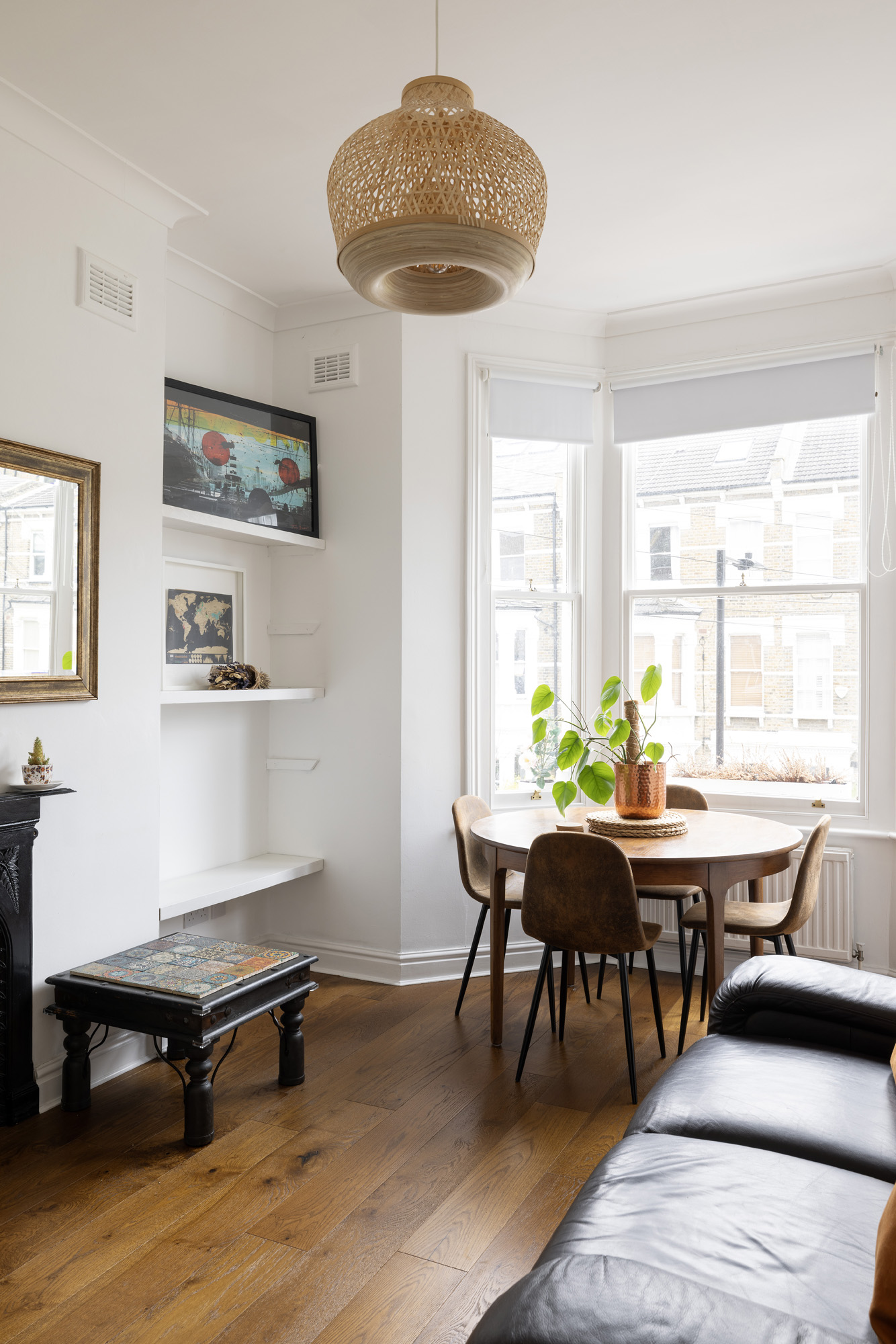 A floral stained glass mural crowns the entrance to the reception room, working in tandem with the dark, soil-brown wood floors. The reception room is cosy, with high ceilings, original bay windows and a bituminous period fireplace that begs to be admired.