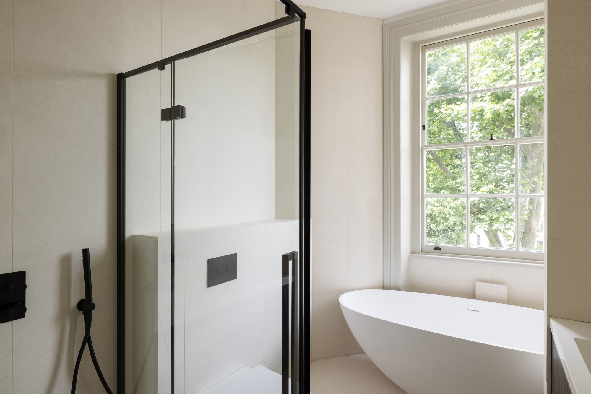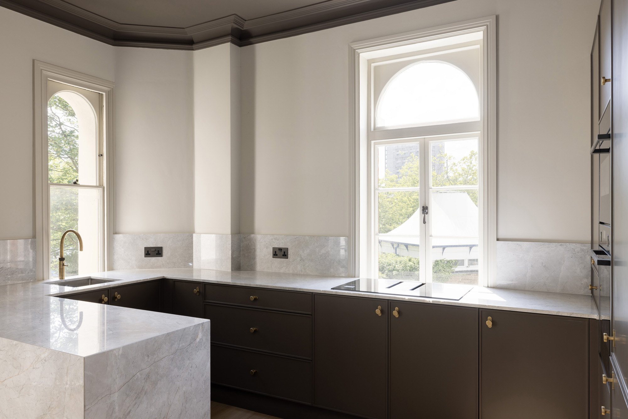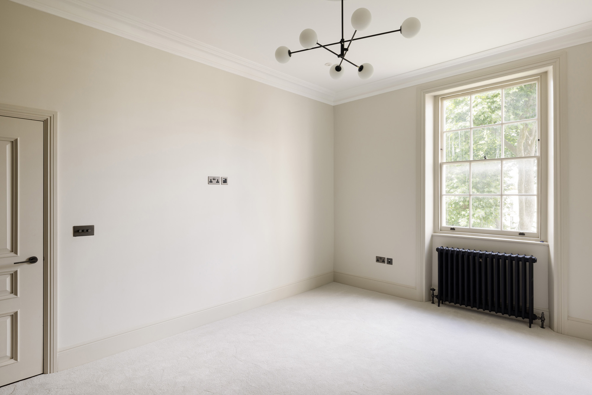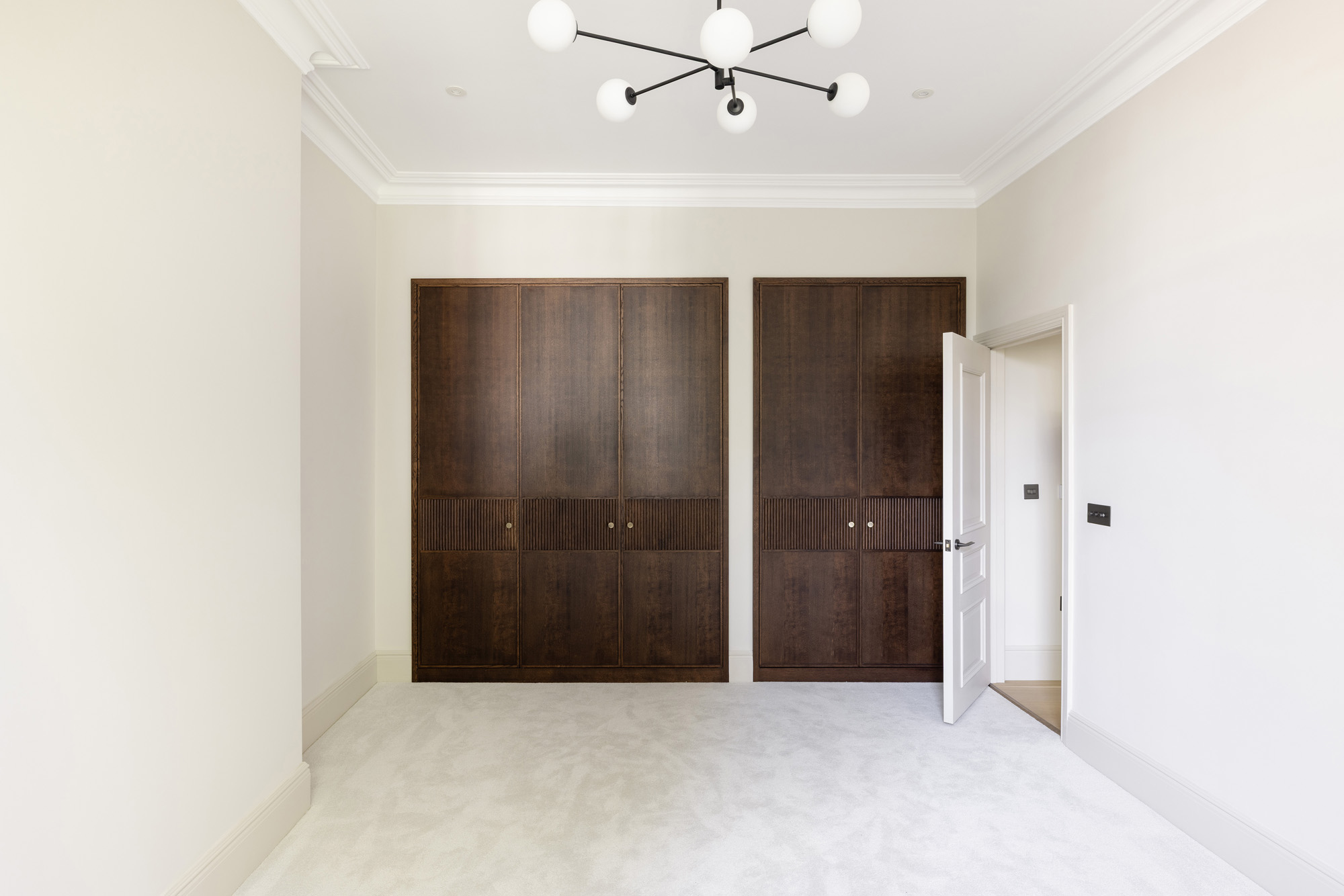 The bedroom is spacious and ethereal, elevated by contemporary cornicing, high ceilings, and a ceiling medallion that recalls the property’s Victorian heritage. Custom, integrated wardrobes in a rich, soil-toned brown lend organic strength, as a large sash window overlooks the leafy grounds of Bristol Gardens. Internal drawers and shelving are being seamlessly added to maximise utility.