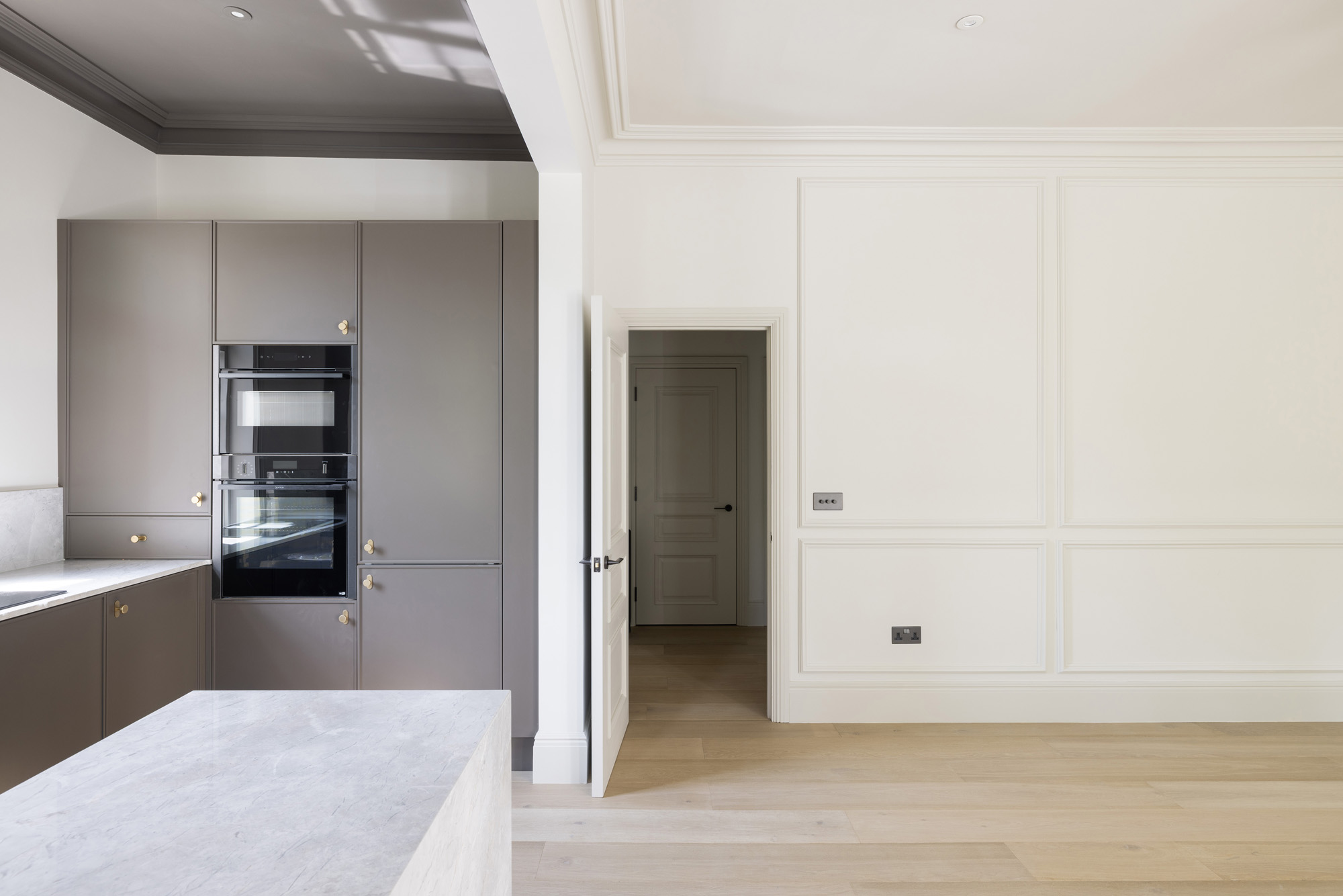 Grandeur meets calm in one sweeping, light-filled space in the open-plan kitchen, dining and lounge. Creamy walls and light wood floors stretch with ballroom scale, anchored by an ornamental cast-iron fireplace and ornate French doors opening onto a private white-stone balcony, framed by classical balustrades. In the kitchen, rich brown cabinets are set against a White Dolomite marble worktop, gold hardware, and state-of-the-art appliances, including a boiling water tap.
