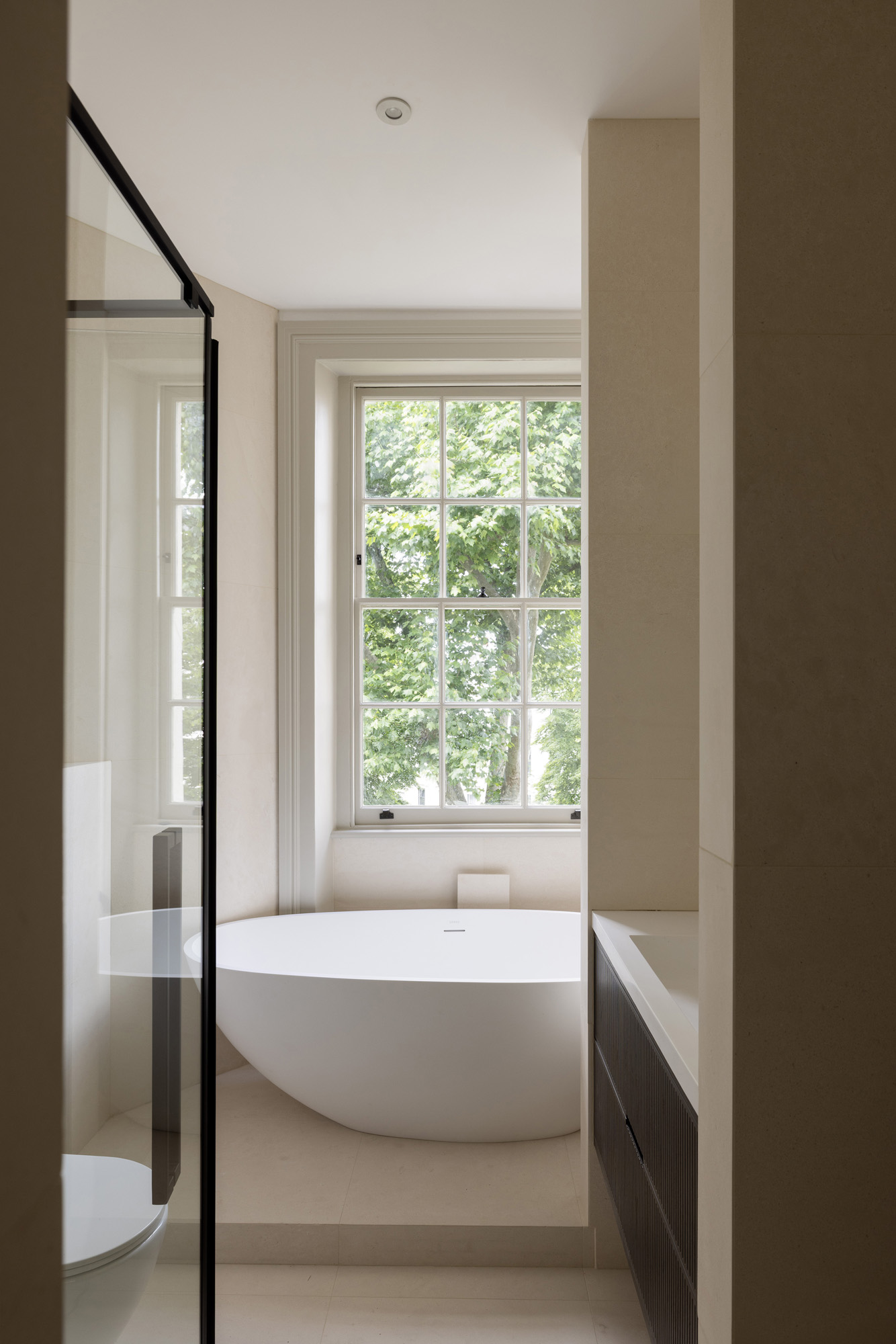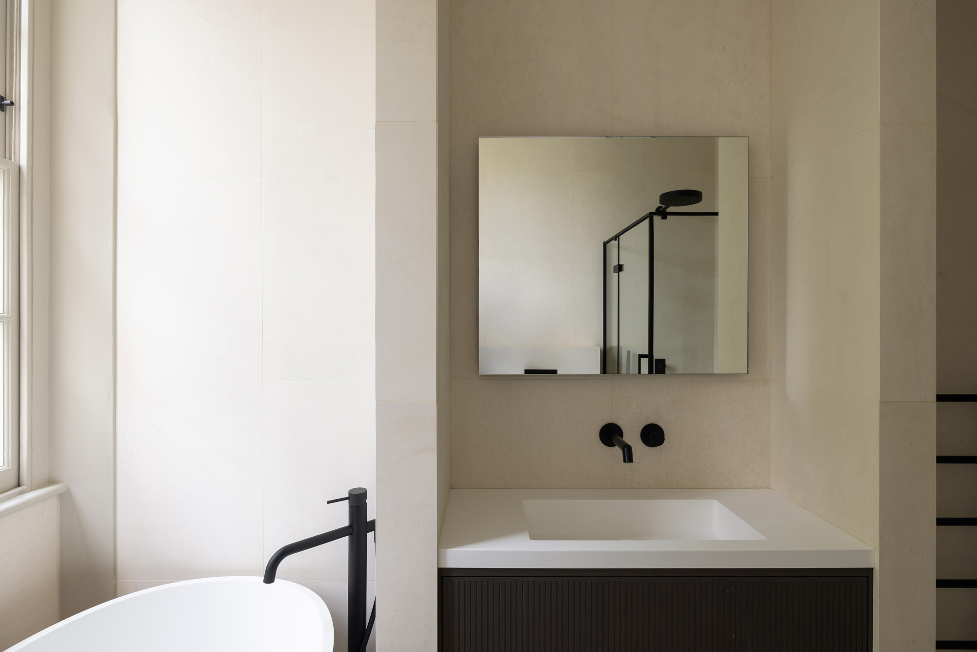 The bathroom suite is a serene palisade, wrapped in soft limestone with fittings from Lusso Stone and Just Taps Plus. The tones are warm and sensual: sand, stone, and ivory white, contrasted by sharp black fixtures that deliver just the right modern bite. A small step up to the elliptical freestanding tub subtly shifts scale, adding architectural nuance to a space designed for ritual and retreat.