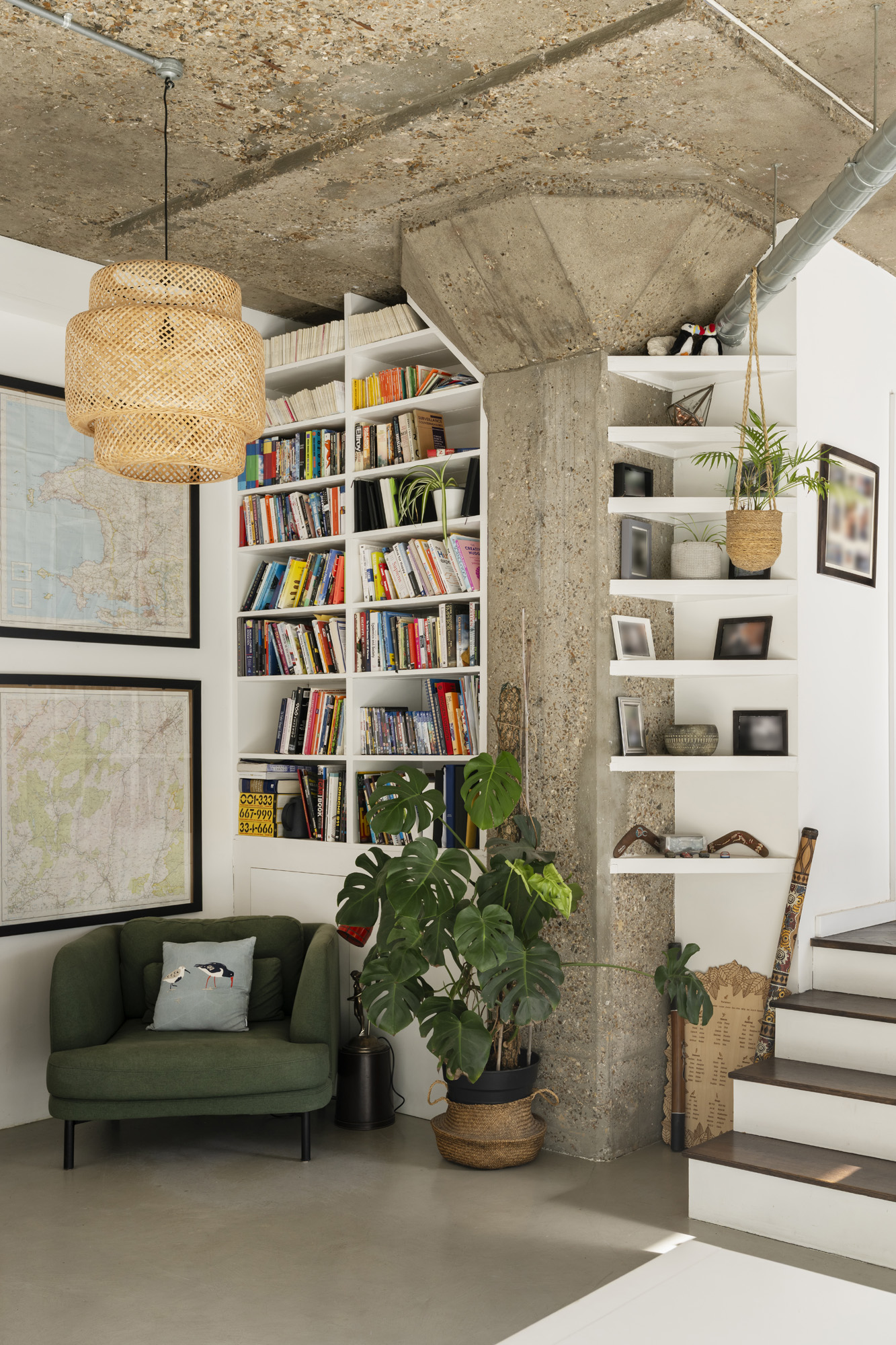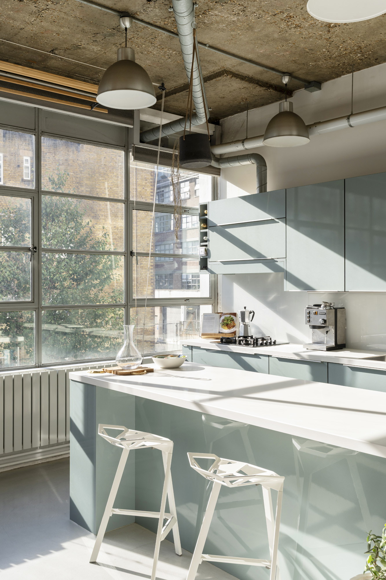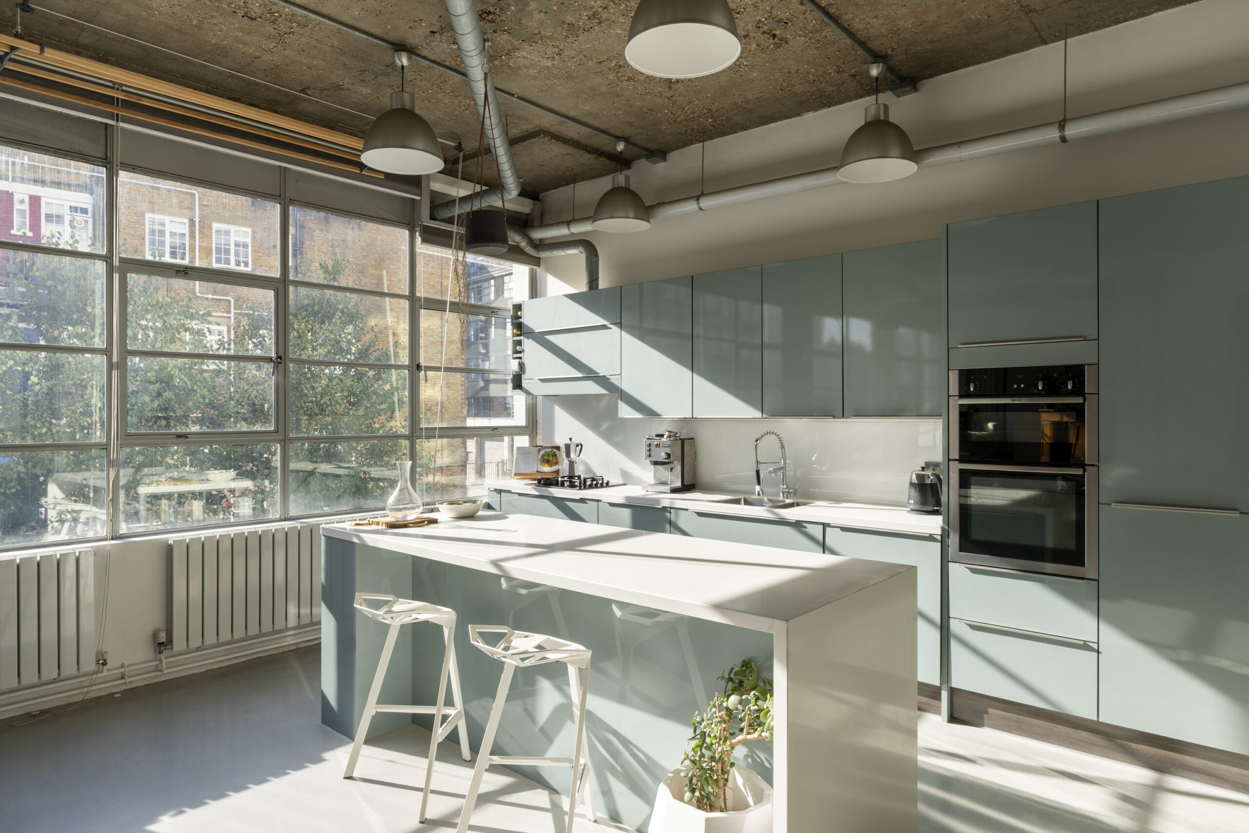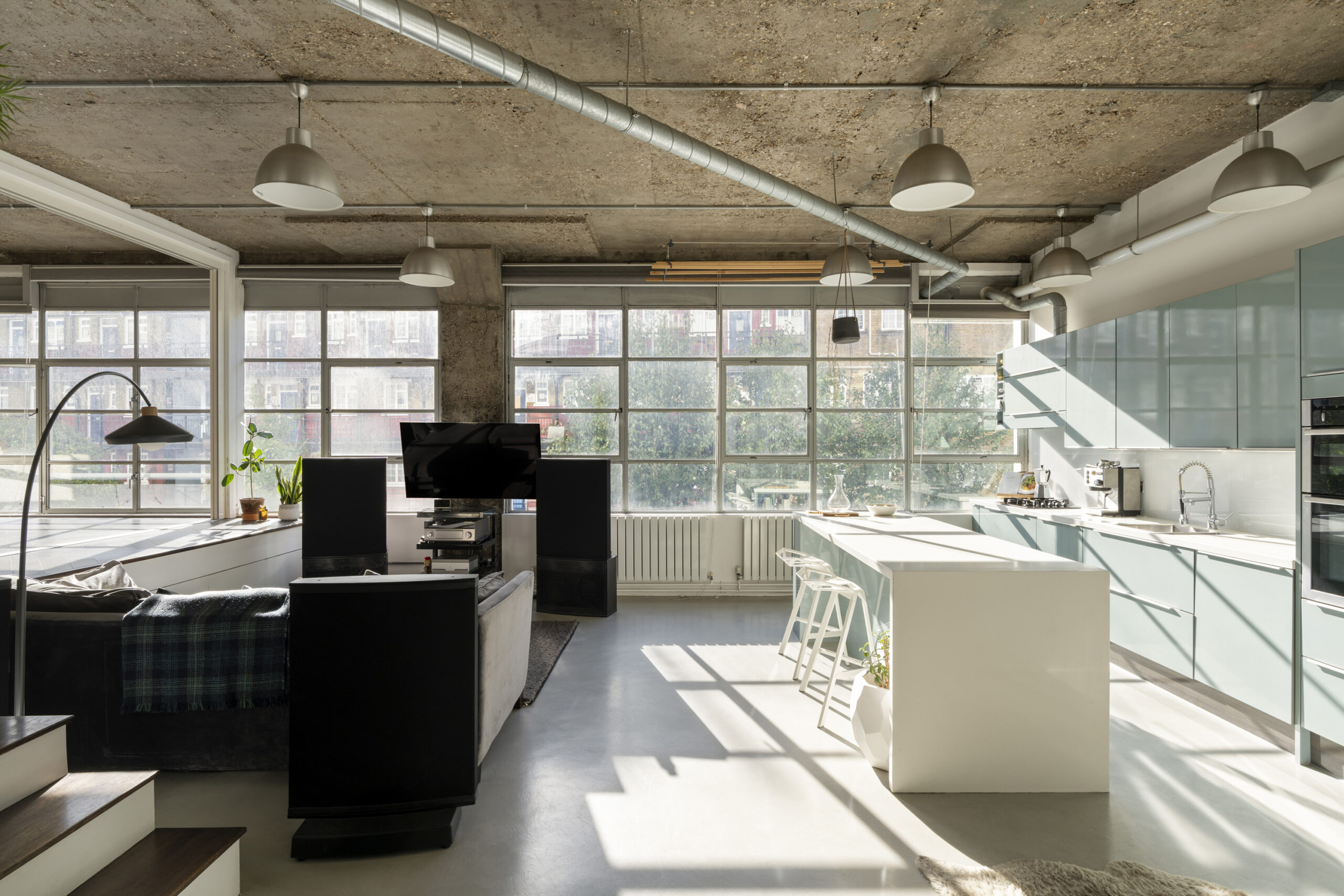 The main living area is expansive. It is defined by soaring 3.2-metre concrete ceilings, micro-concrete floors, and full-width Crittall windows with thermal blinds that maximise natural light. Light floods in, and air moves freely. After the intensity of London, this feels distinctly open.
