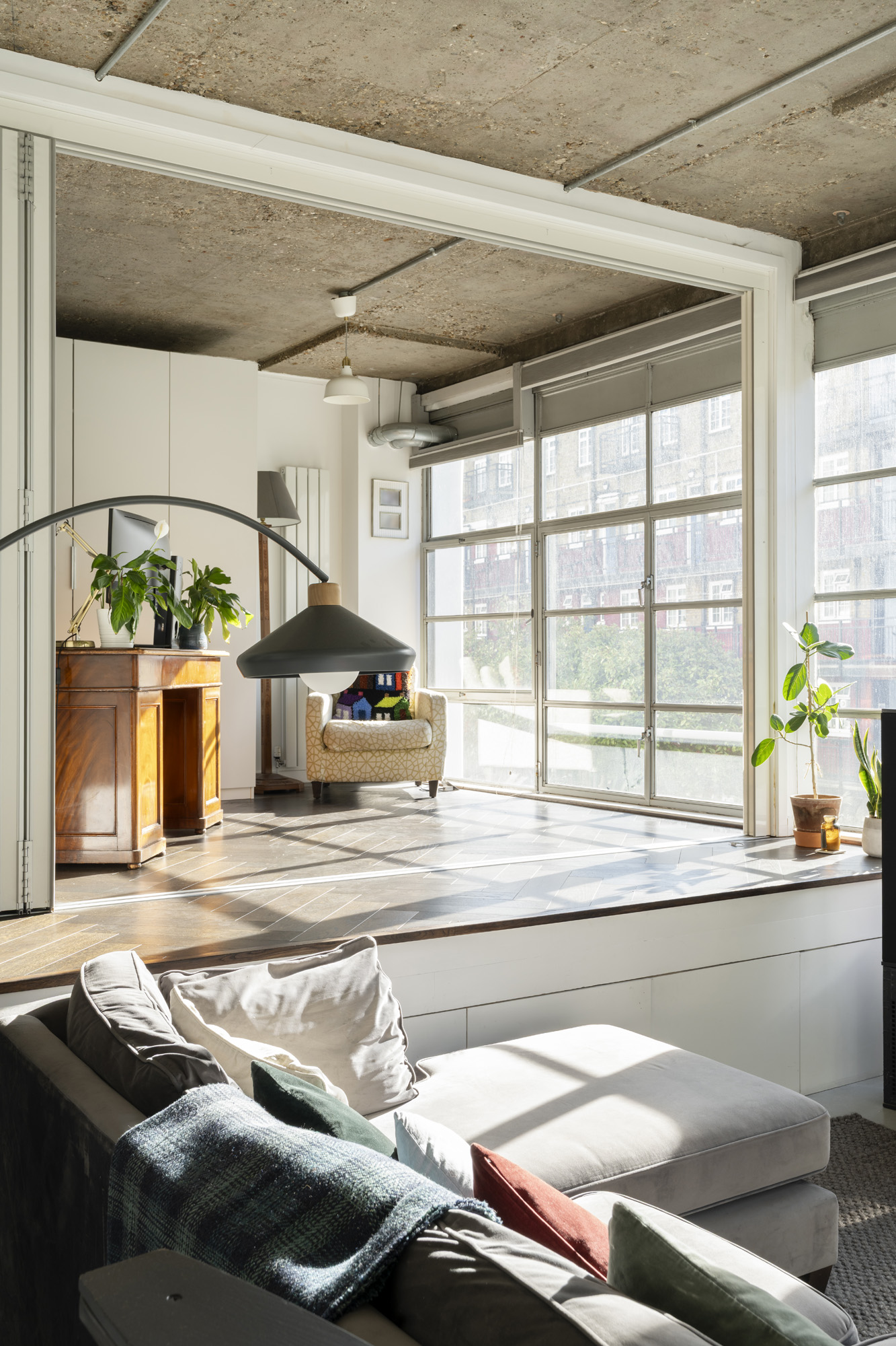 A bespoke, split-level space sits elevated above the main floor, finished in engineered herringbone flooring. It’s ideal for use as a home office, guest room, or studio. An industrial-spec soundproof folding partition by London Wall allows the space to be closed off or opened up. Separate when needed. Connected when preferred. The apartment is formally recognised as a live-work unit, offering flexibility for both residential and professional use.