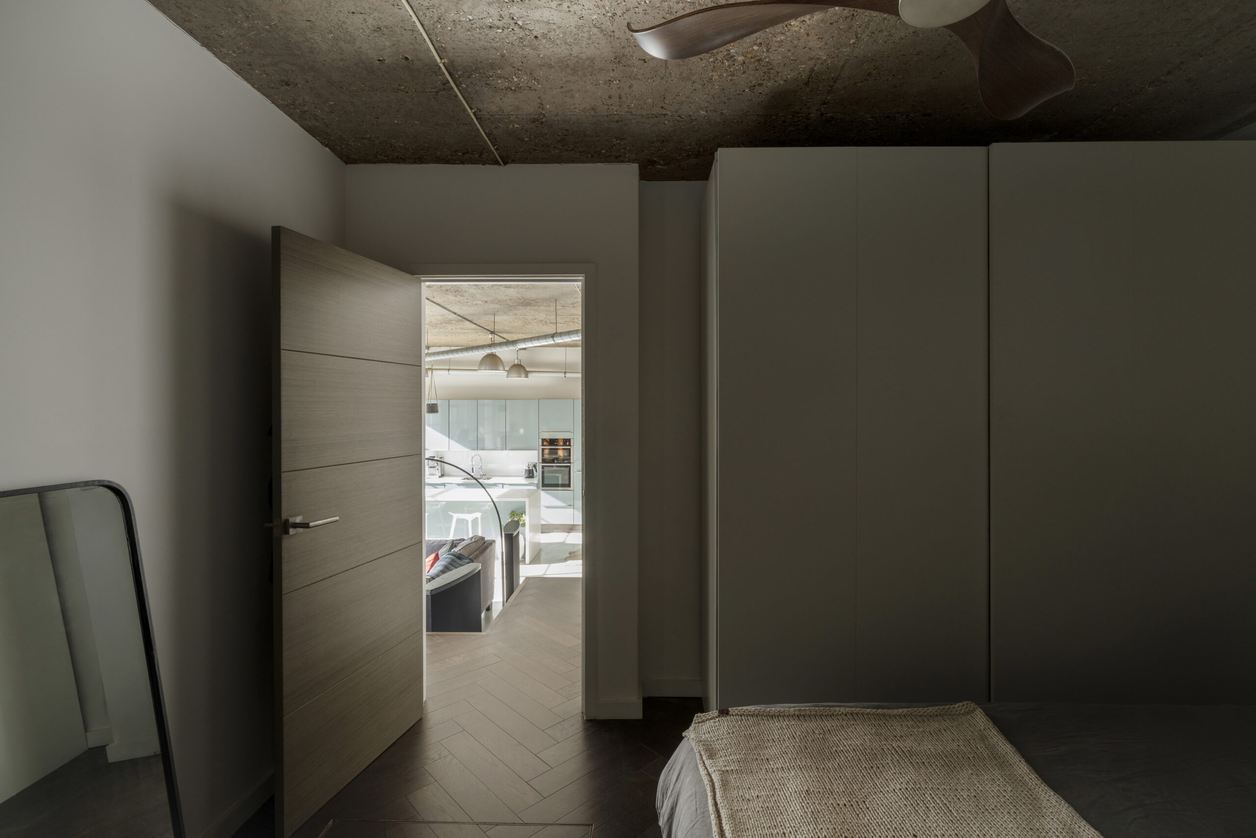 The principal bedroom is a quiet and spacious retreat. It fits a king-size bed comfortably and continues the palette of warm wood floors and concrete textures. A vertical column grounds the space without overwhelming it. Lighting is subtle and integrated. Ventilation is handled by wall-integrated fans for extraction, cleaning, and cooling, with an additional ceiling fan for support in warmer months.