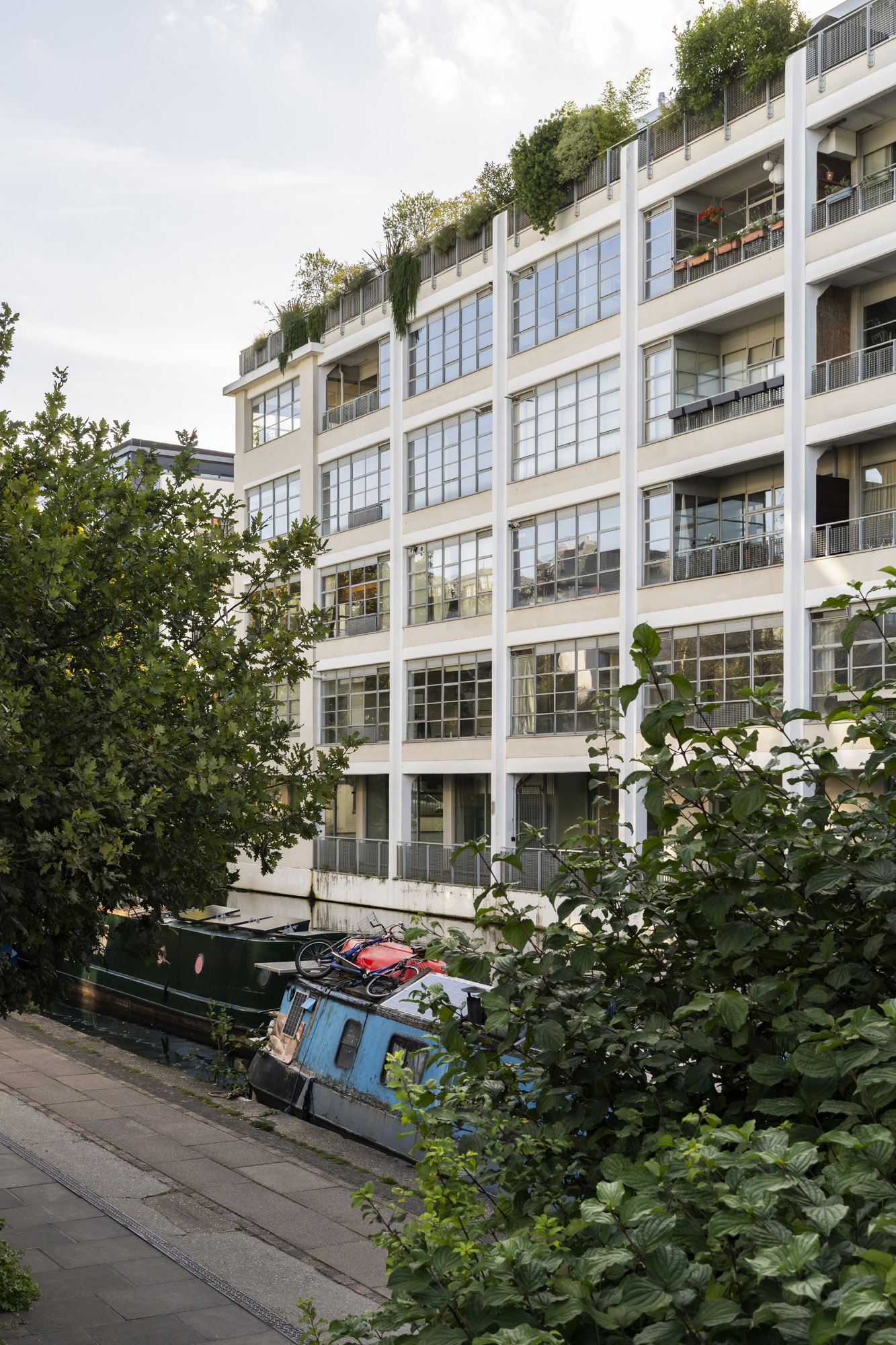 The Canal Building is one of East London’s most established warehouse conversions. Residents benefit from 24-hour concierge, secure entry, and an allocated parking space visible from the apartment. Two communal terraces extend the living space: one looking out across the skyline, the other tucked beside the canal, edged by olive trees and lavender. The building has an active residents’ board and a strong sense of community.