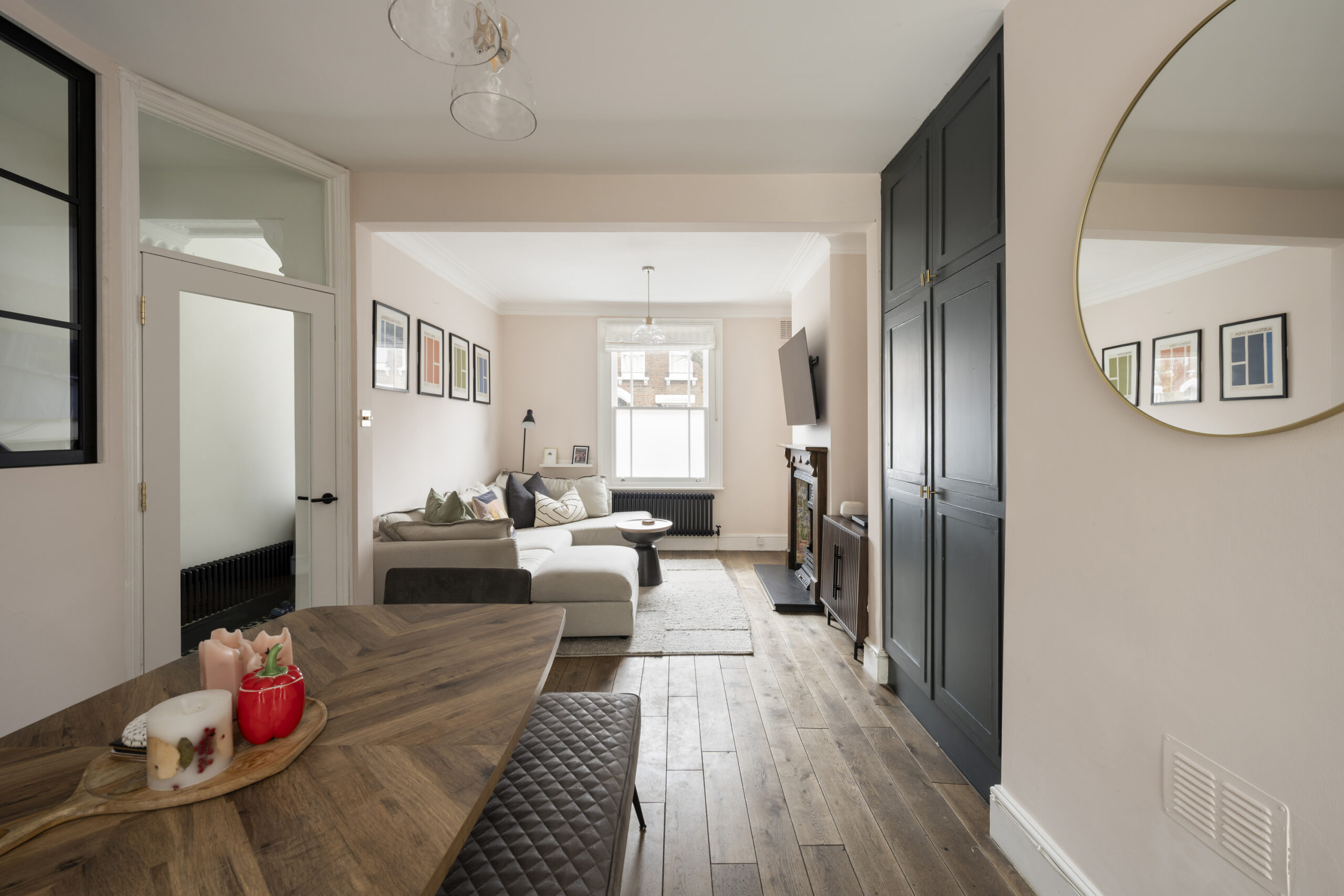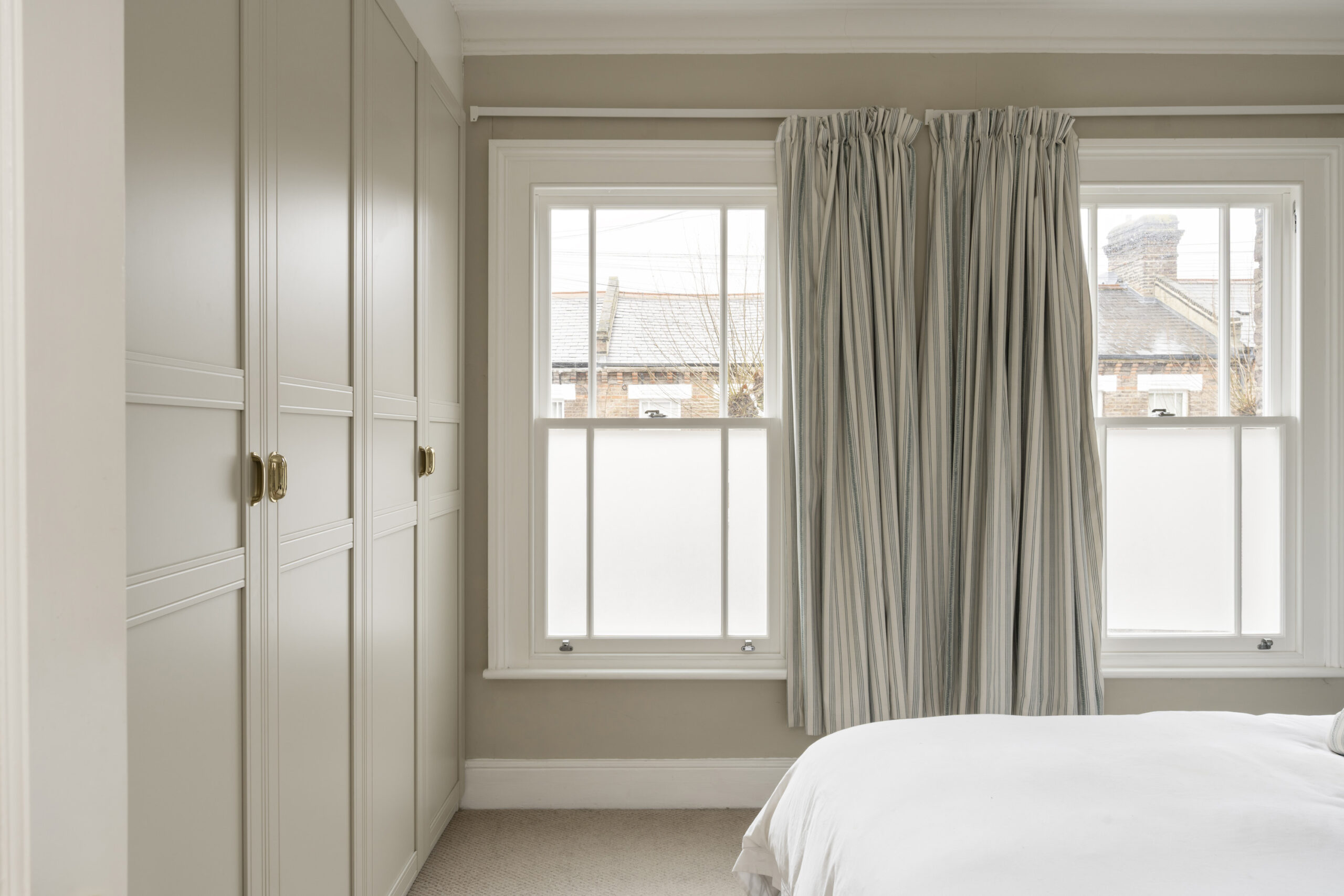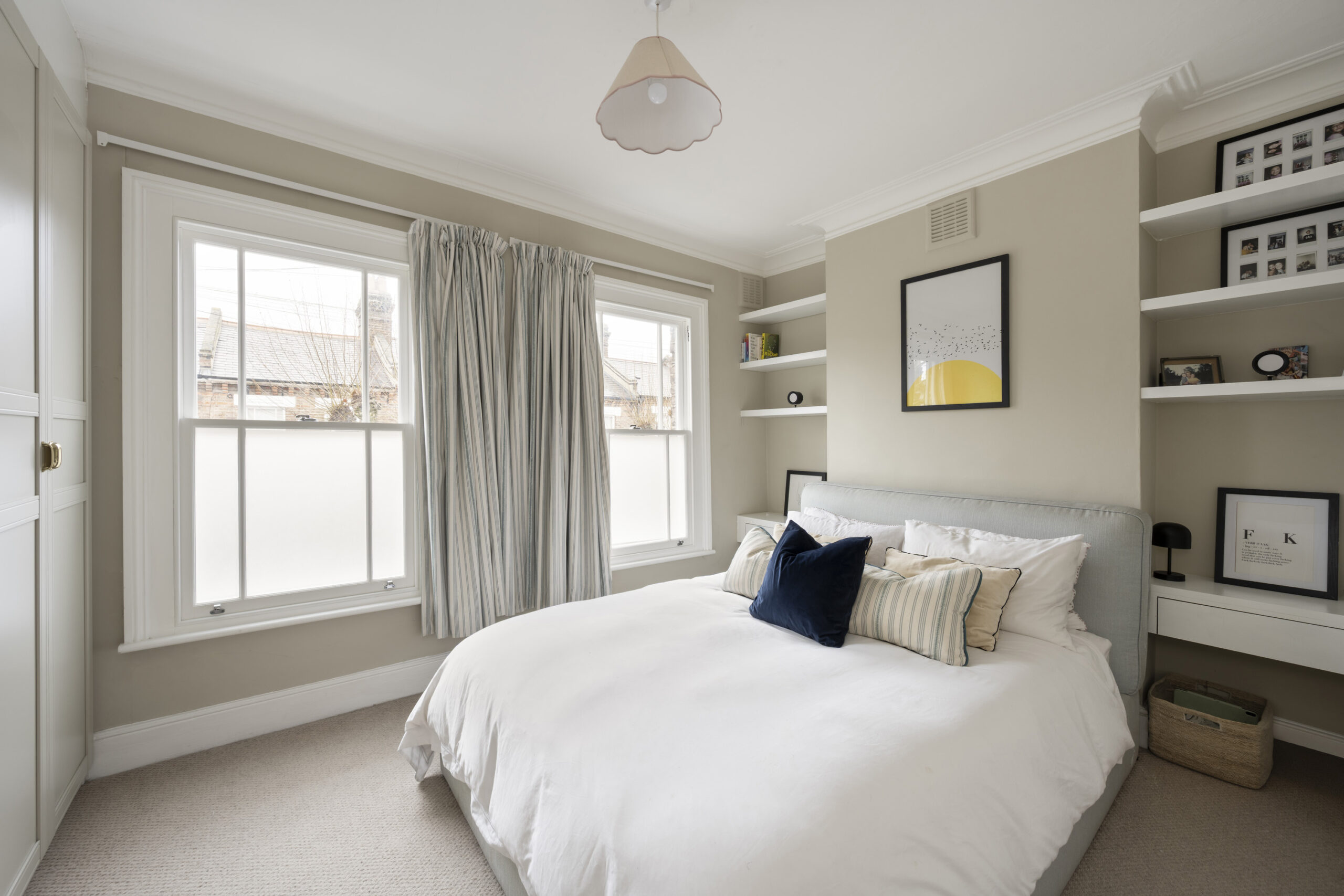 Three bedrooms span the upper floors. The smallest is currently configured as a home office. The loft bedroom makes intelligent use of eaves storage and is flooded with natural light from new Velux windows. The principal bedroom is a beautiful study in neutrals.