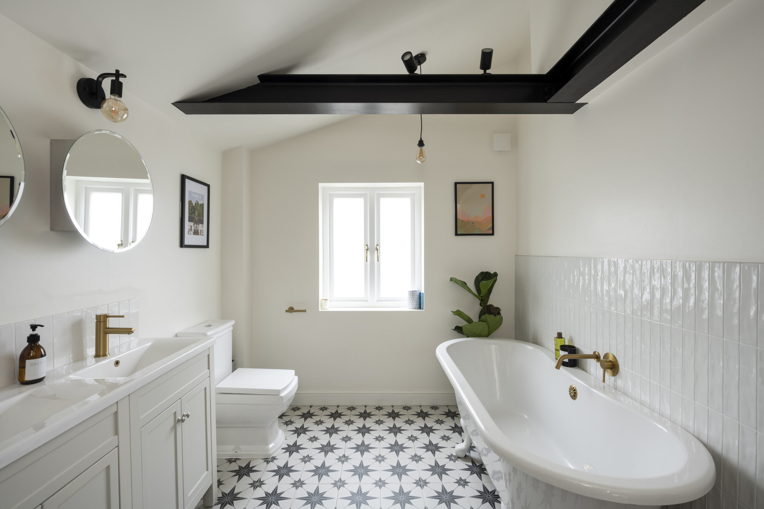 Upstairs, the main bathroom is a revelation. Everything is Lusso Stone: fixtures, sanitary ware, glass, the lot. Black-painted steel support beams are exposed, cleaving through the room with industrial elegance. Touches of cream, white, and moody blues give it a Santorini-inspired calm. There’s underfloor heating, too.