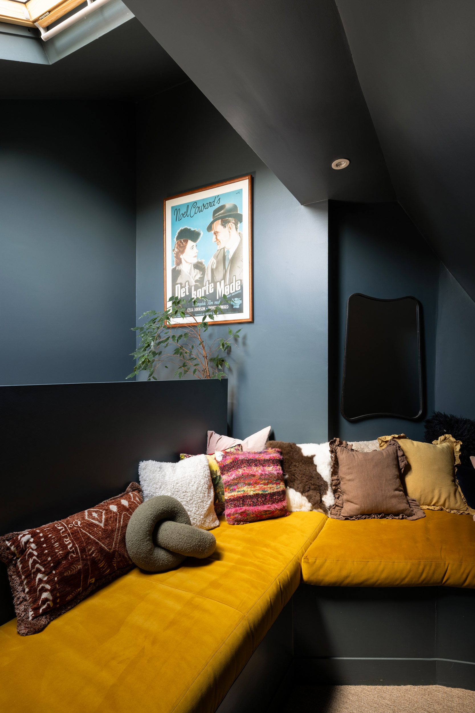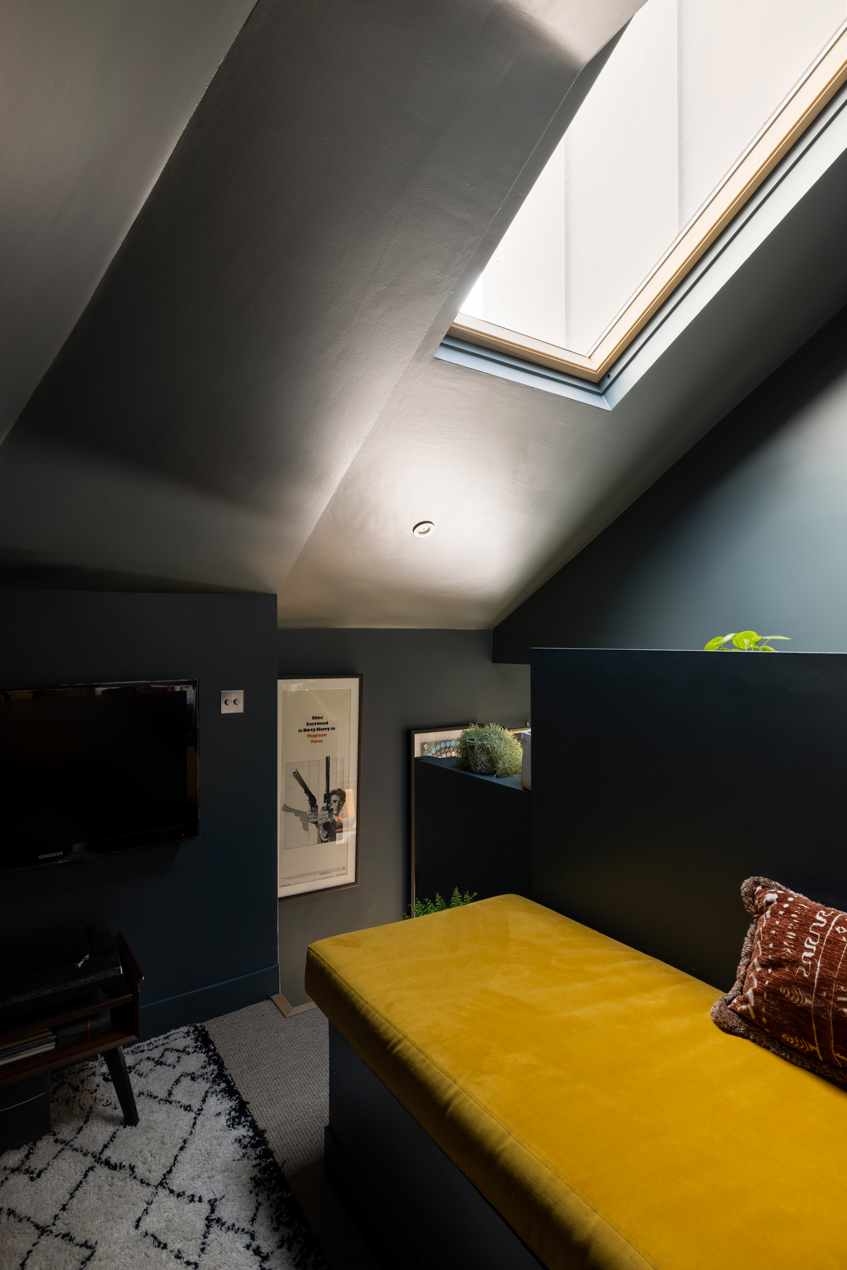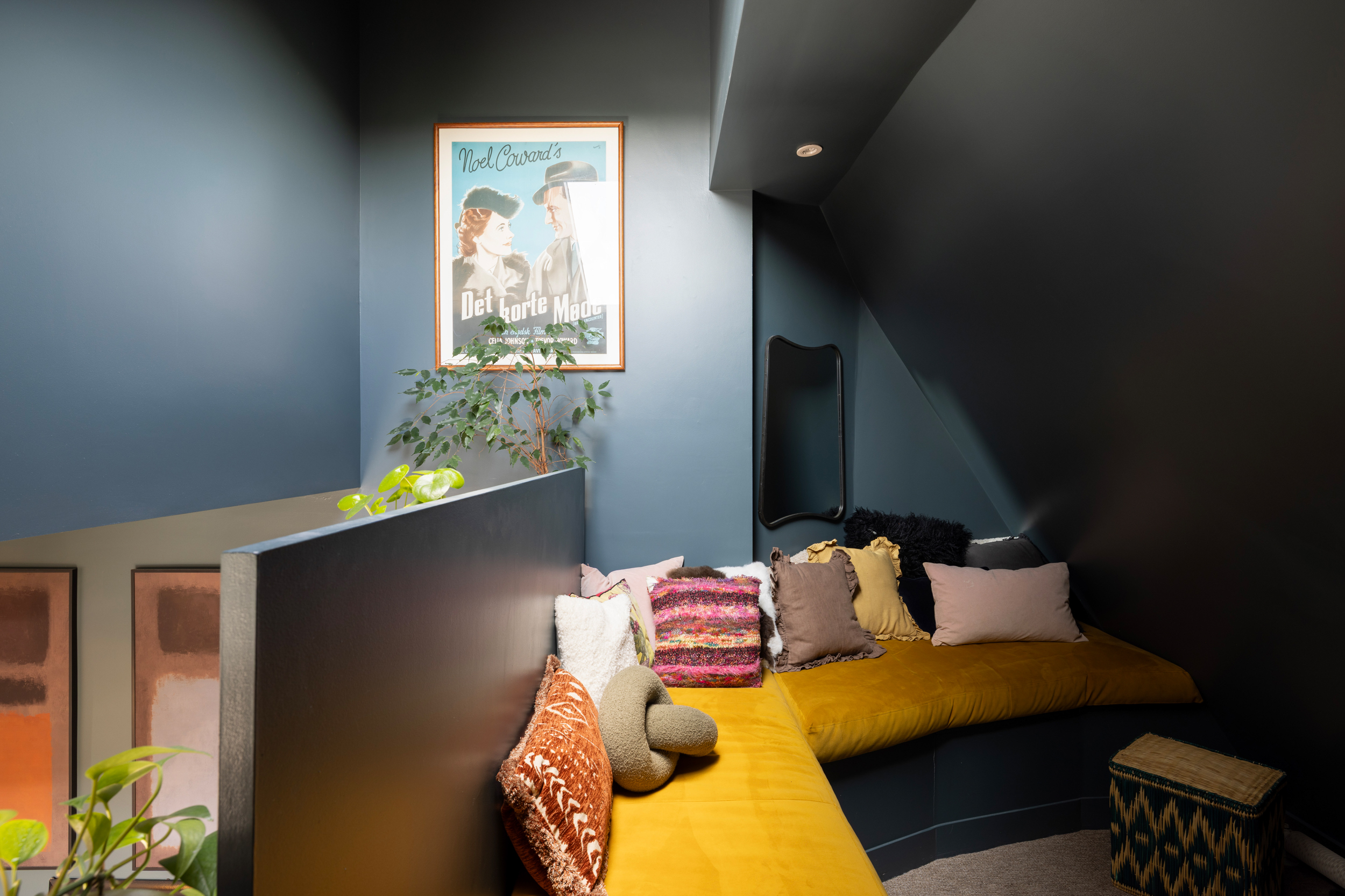 The main reception room is awash with rich, calming tones. Walls and ceilings are painted in a misty green-grey-blue, framing original sash windows and offering leafy park views. Architectural features animate every corner: recessed shelving, a dramatic ceiling pitch, and an elevated snug with sisal carpeting and banquette seating. Ambient lighting is layered throughout to create a space that shifts effortlessly from lively hosting to restorative calm.
