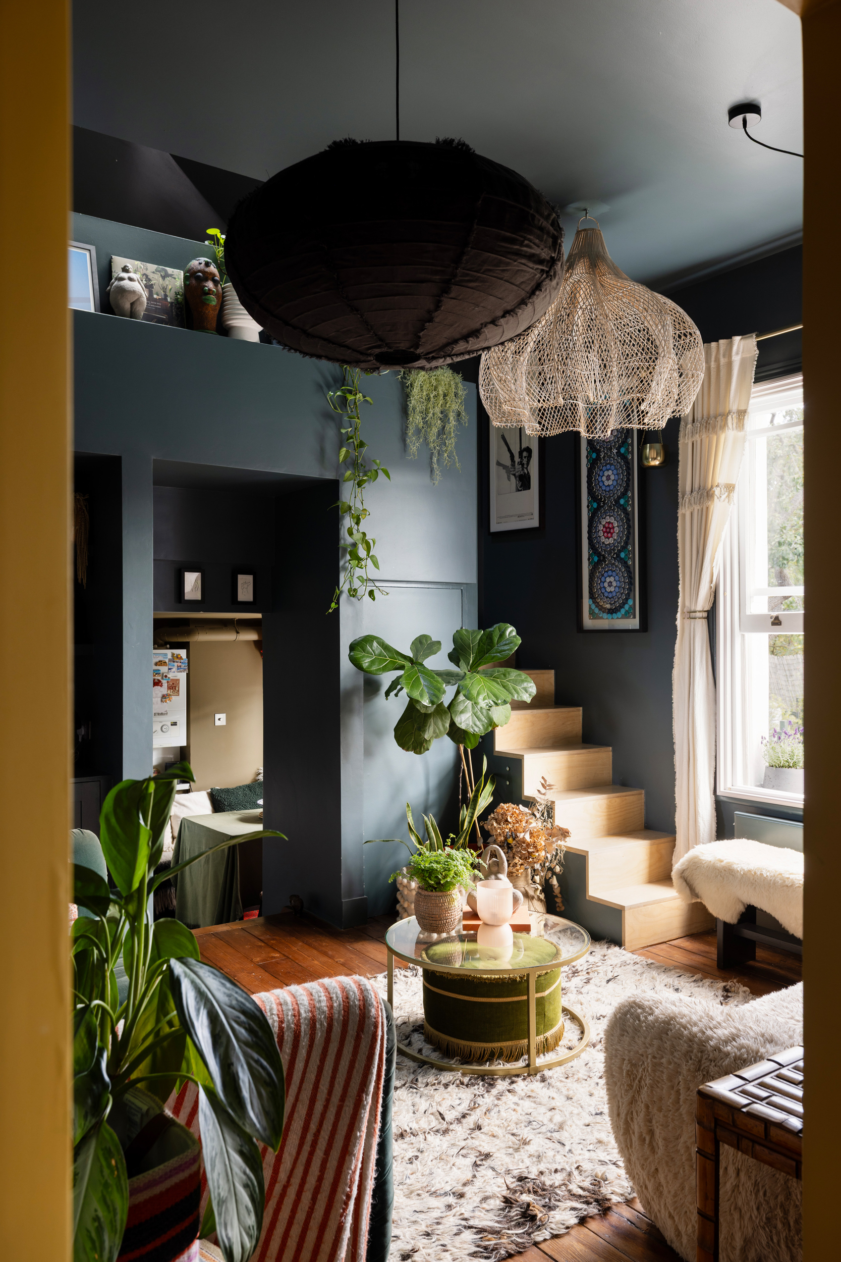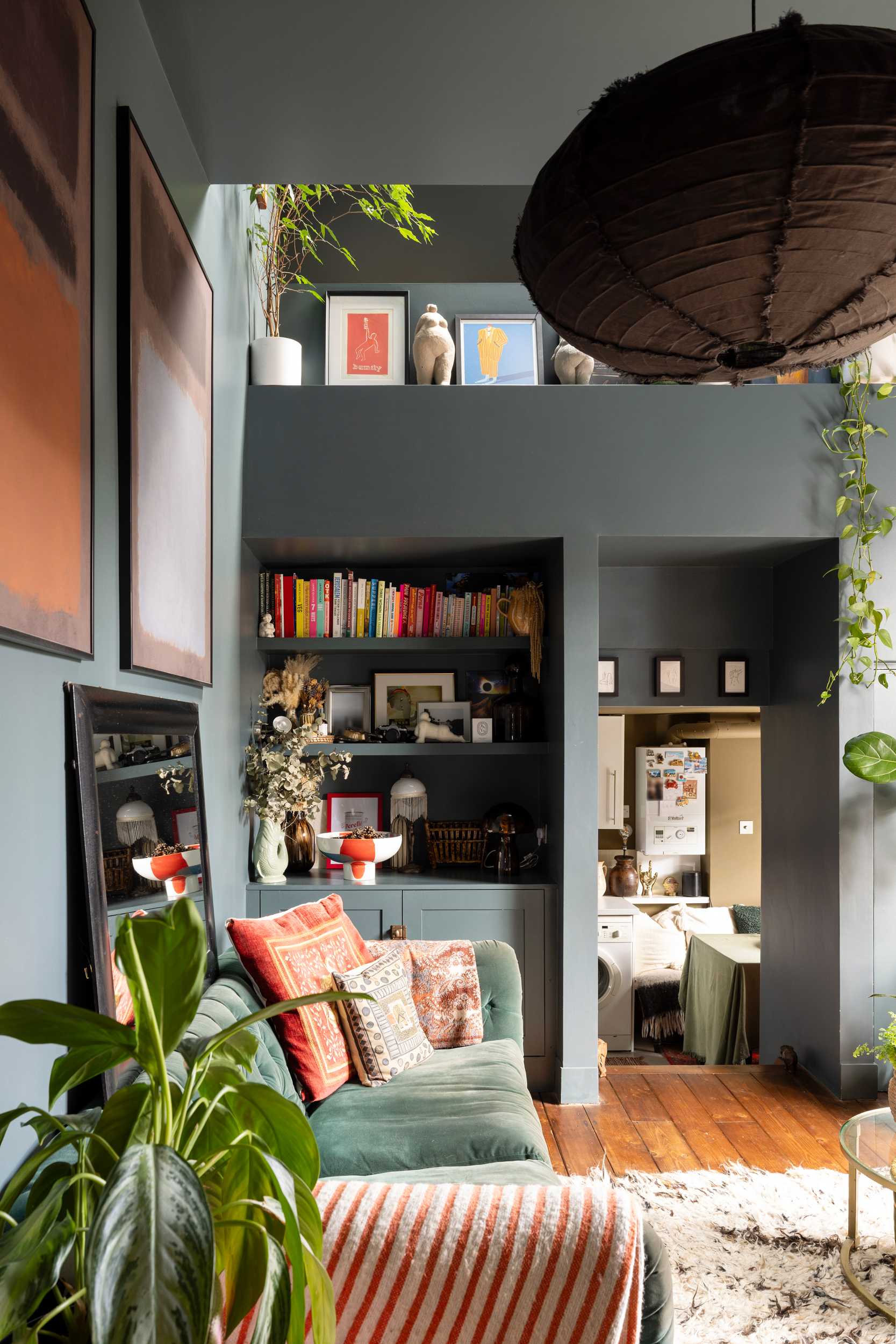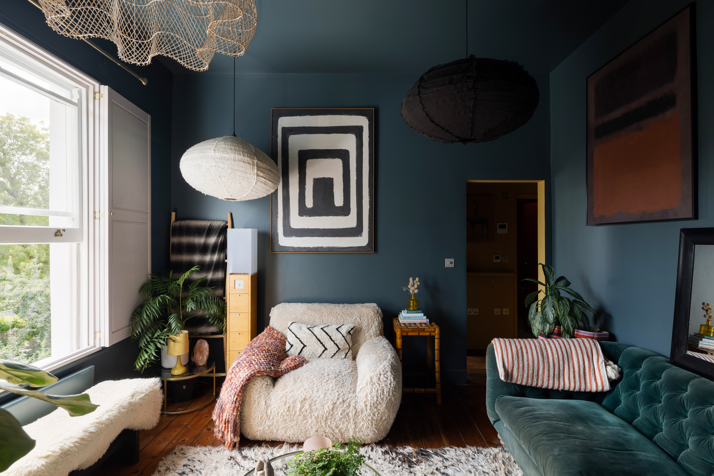 The main reception room is awash with rich, calming tones. Walls and ceilings are painted in a misty green-grey-blue, framing original sash windows and offering leafy park views. Architectural features animate every corner: recessed shelving, a dramatic ceiling pitch, and an elevated snug with sisal carpeting and banquette seating. Ambient lighting is layered throughout to create a space that shifts effortlessly from lively hosting to restorative calm.