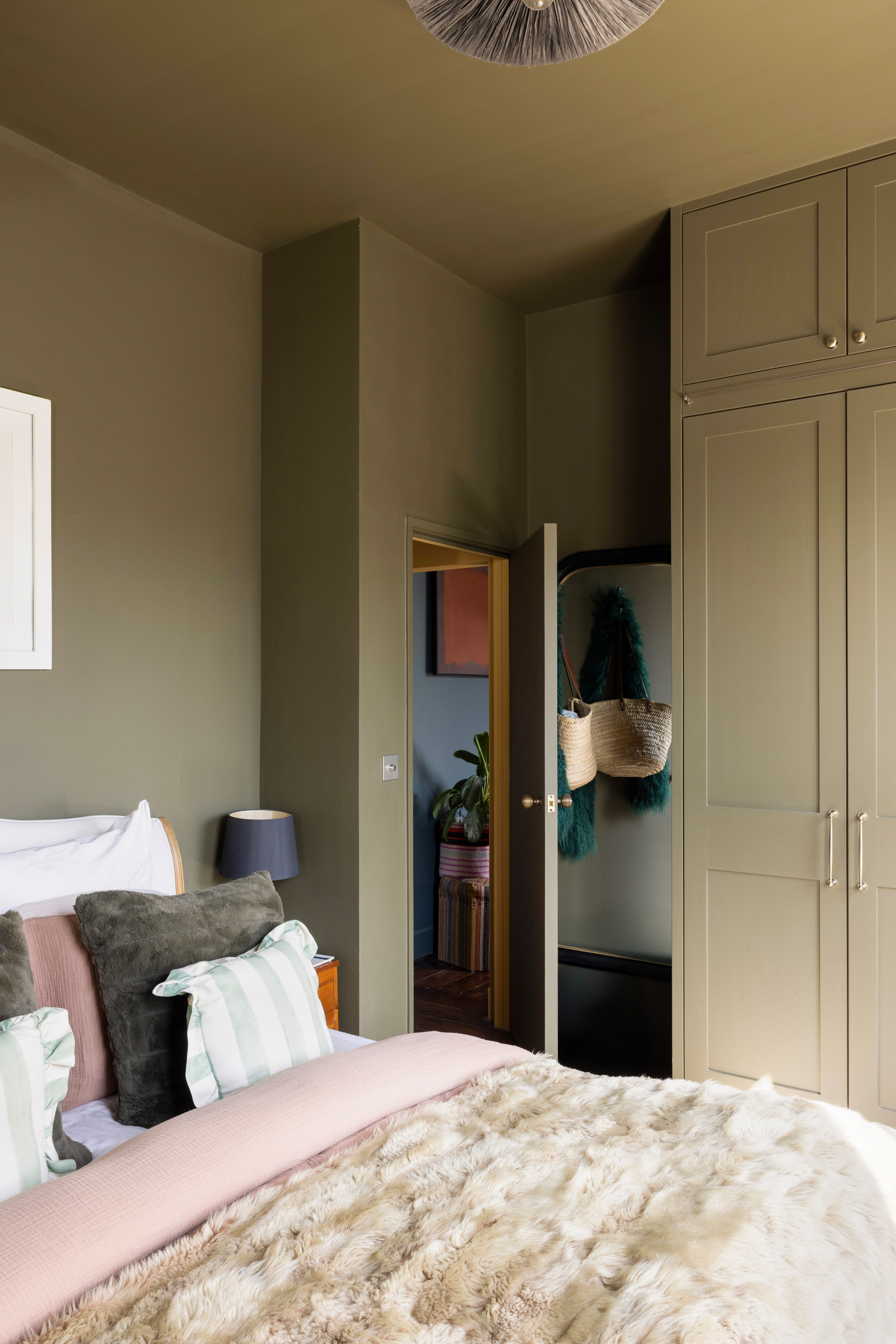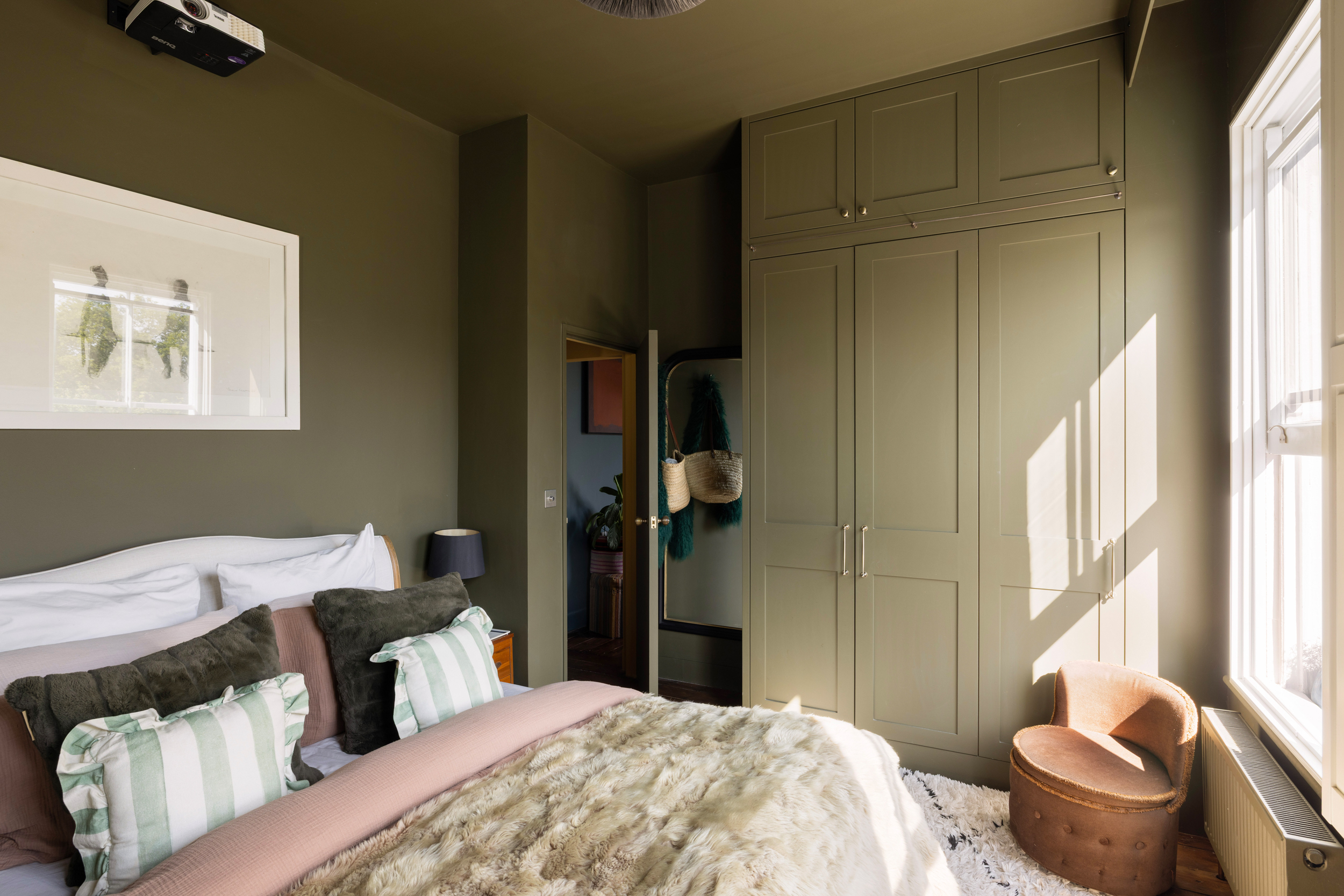 The bedroom is a restful sanctuary, painted in tranquil sage and stone tones with large fitted wardrobes. A built-in projector and drop-down screen transform the room into a private cinema at the touch of a button.