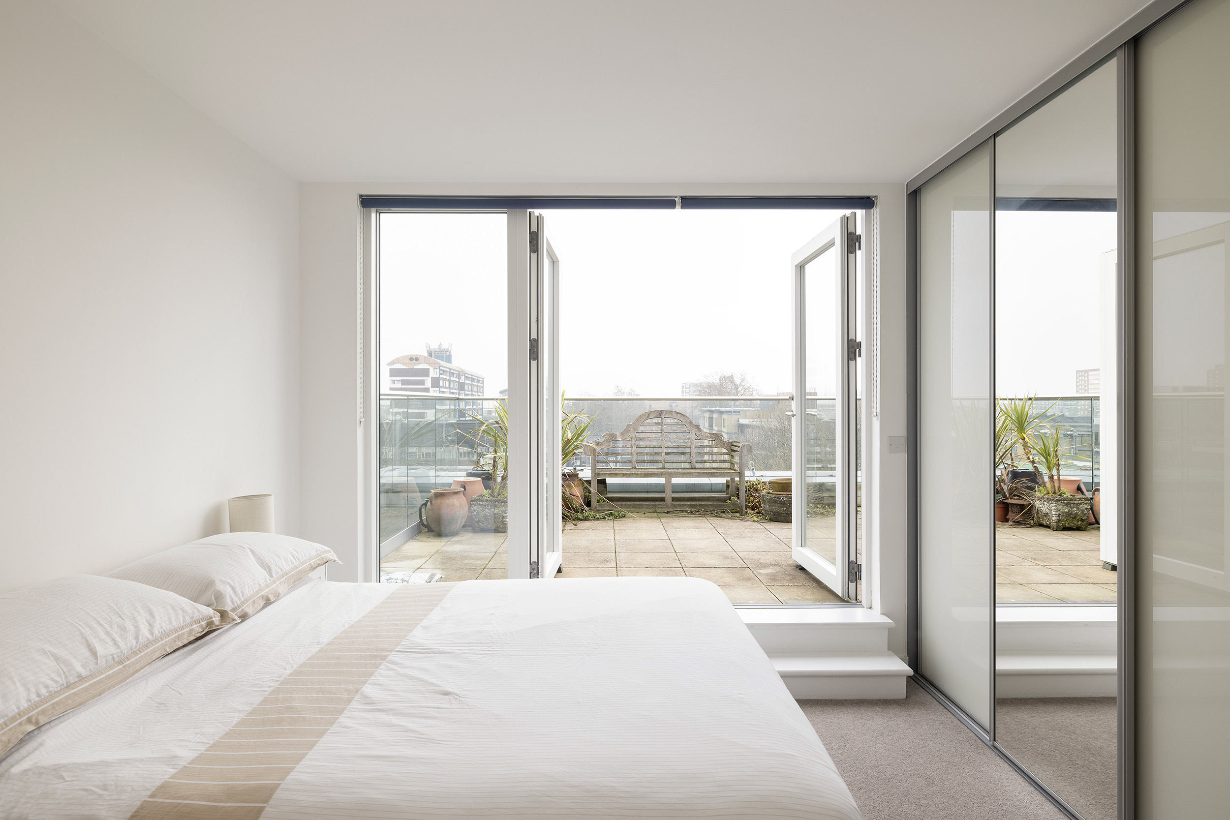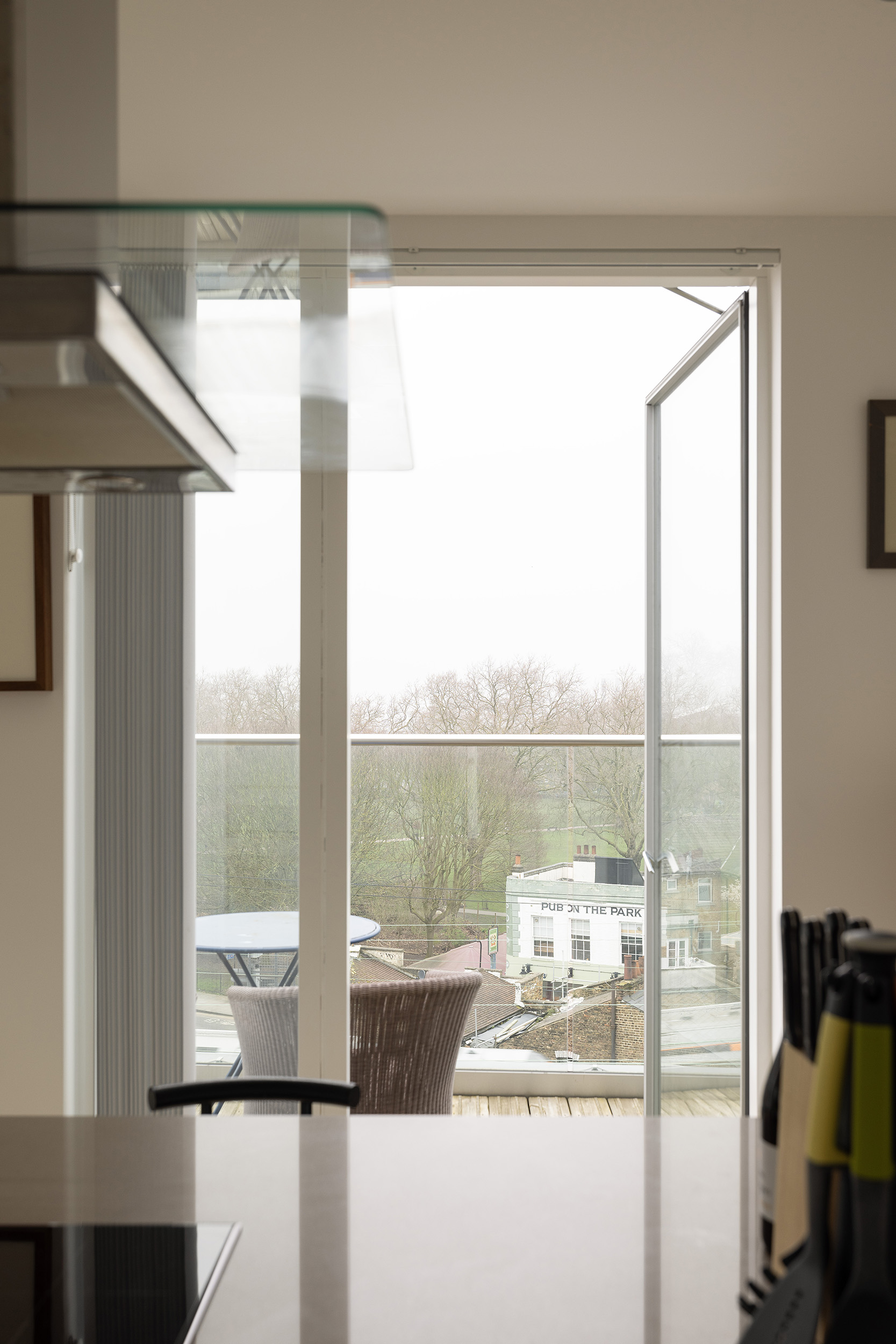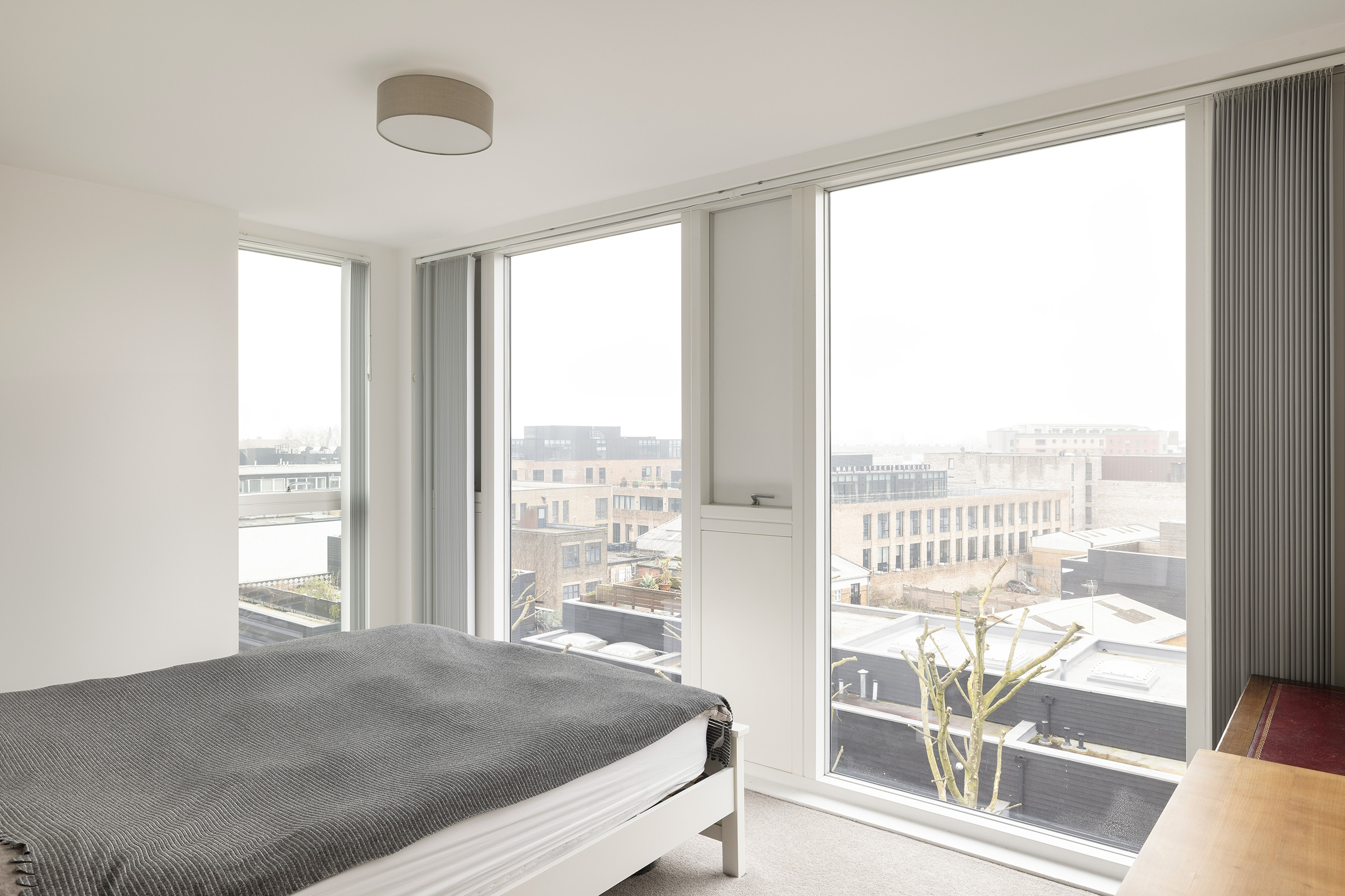 The main hub of the penthouse—a 35ft open-plan kitchen reception—is, in itself, a glorious observatory. Lit triumphantly by massive panoramic windows, the surrounding area—an exciting agri-industrial world of bristling trees, green parks, railway tracks and skyscrapers—can be gleefully studied or hidden away by vertical shutters that feel charmingly imitative of 80’s galleries.