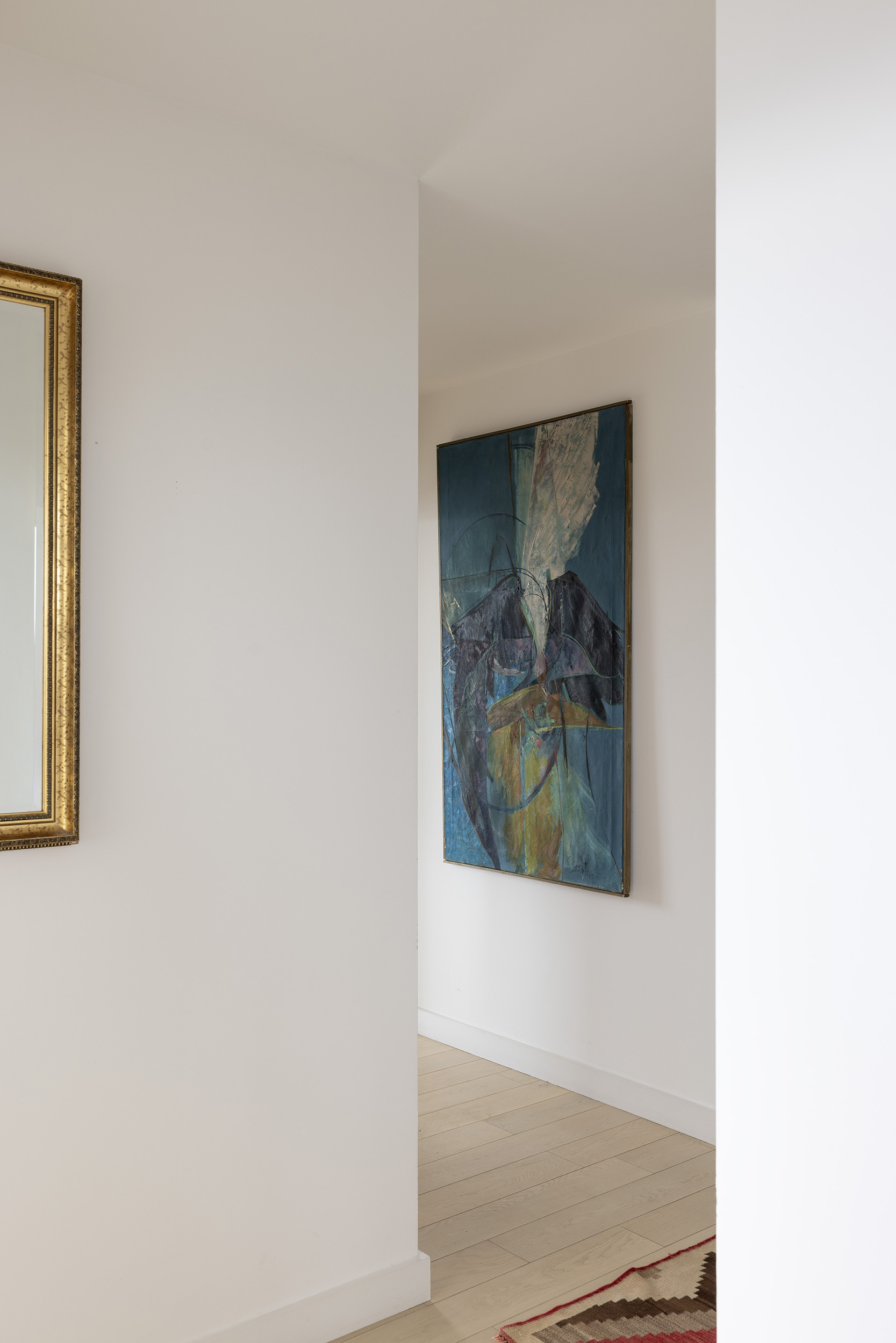 The white-walled entrance corridor breaks open like a crucifix, softened by the warm pine doors and vintage brown furnishings.