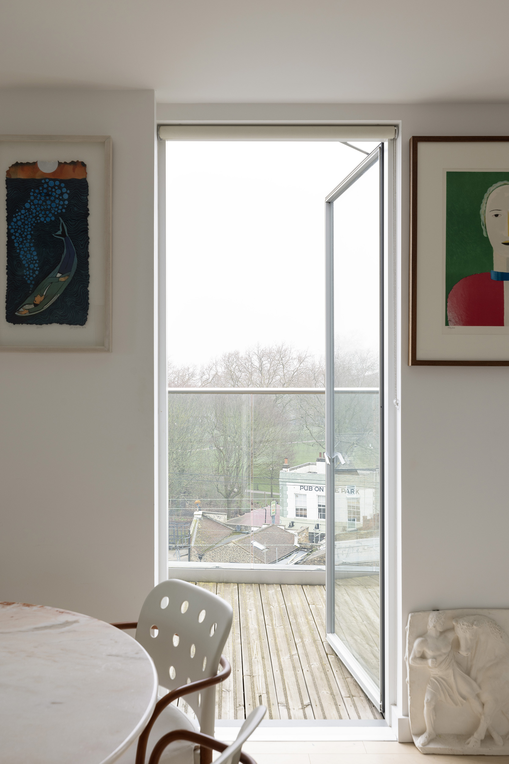 The kitchen is gloss-white and meticulous, opening out onto a private, wooden-slatted balcony.