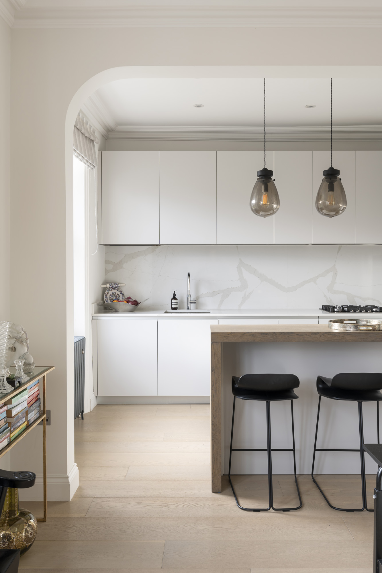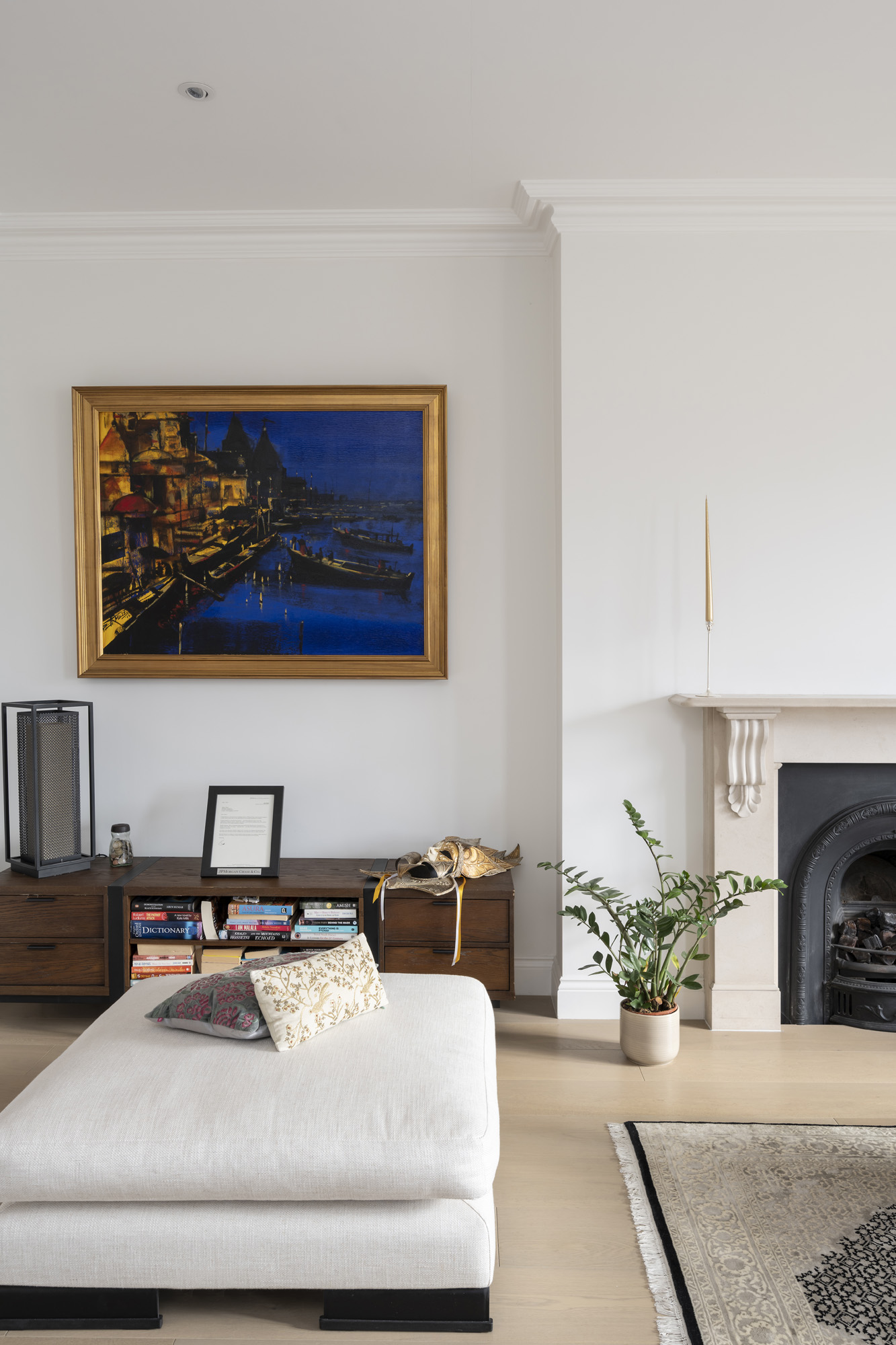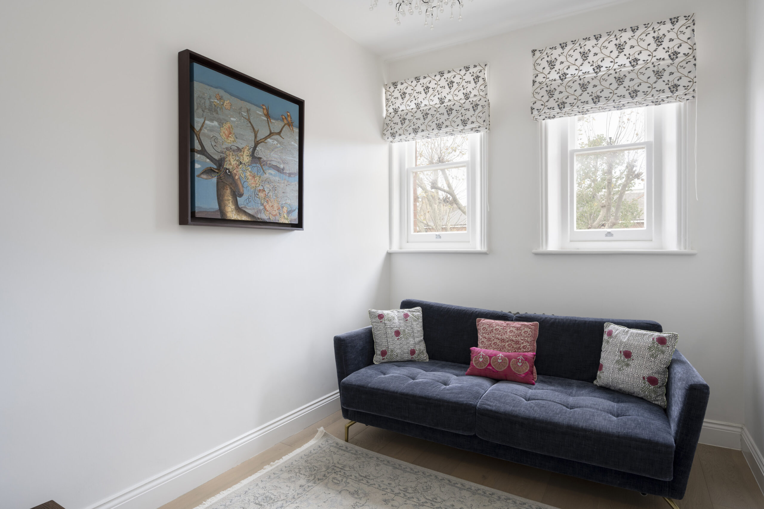 The property stretches blissfully over 970 square feet of expertly curated and designed modern living space. There’s a contemporary regality to the open-plan kitchen reception, where period features are preserved and celebrated and fresh, neutral tones work harmoniously to reinvent the space for the modern homeowner. It’s bright and refined; bathed in the daylight that seeps in from original sash windows. Sweeping blond oak floors feel chic and charmingly mid-century, as high ceilings– grandiose and sumptuous– create the perfect breeding ground for natural light. Miele appliances glimmer in the kitchen: simple, timeless and sophisticated.
