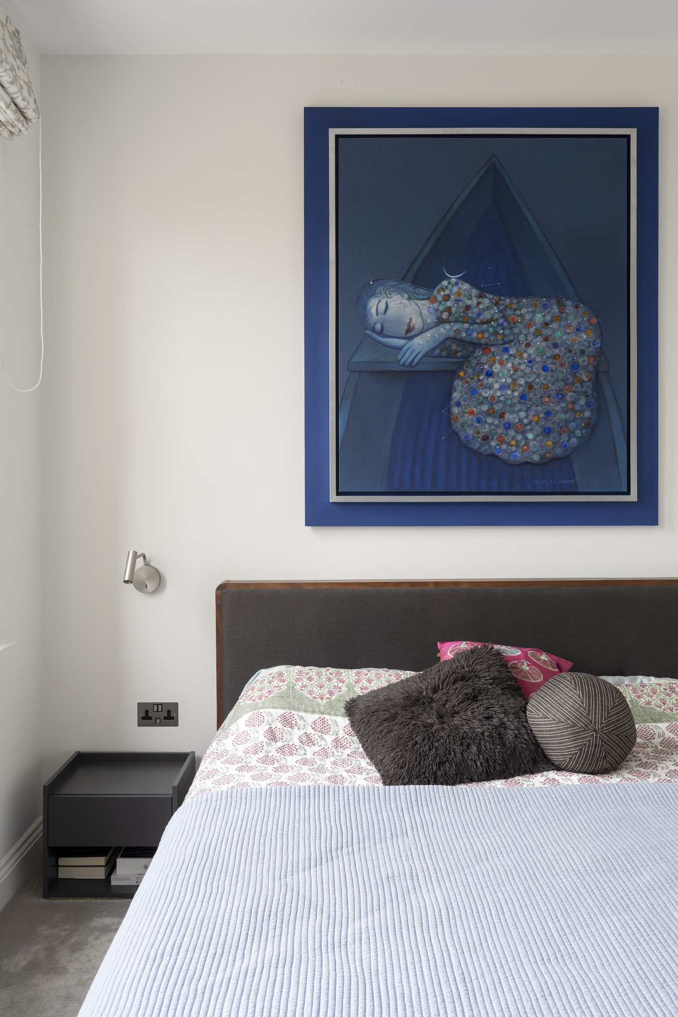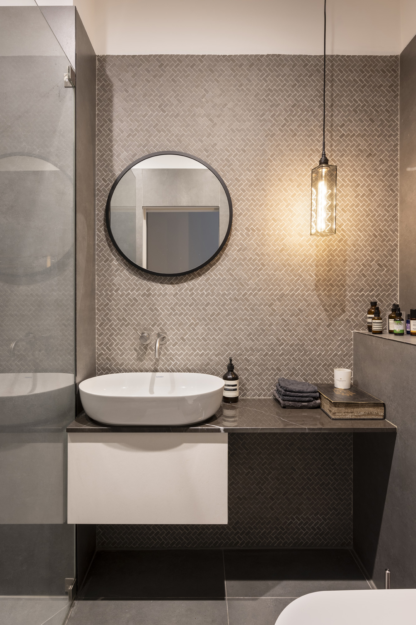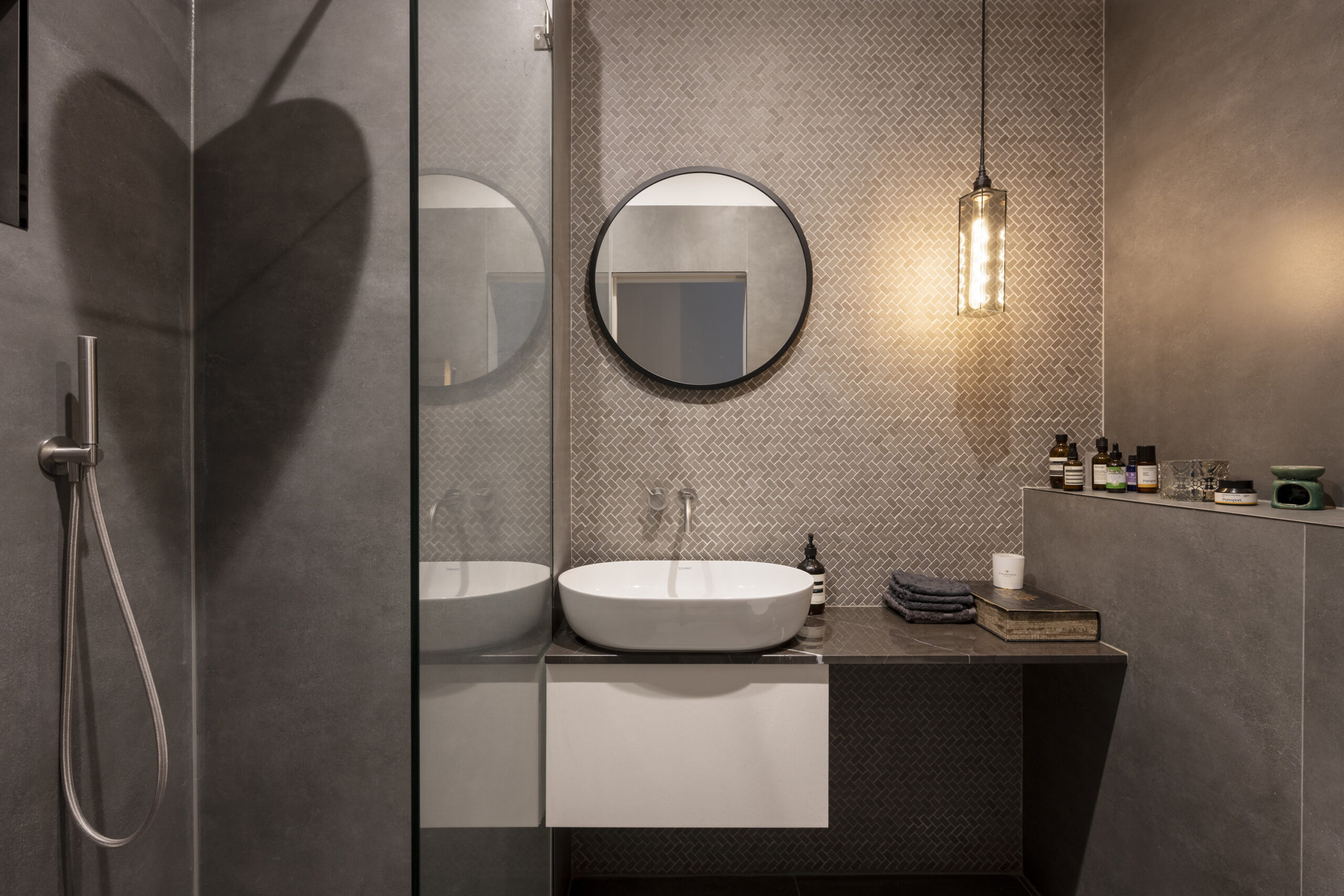 The principal bathroom counteracts the brightness and neutrality of the rest of the property with concrete-effect tiles and warm grey overtones. There is a moodiness here– something that feels distinctively sexy and cosmopolitan: a space to cleanse and recharge among the colours and powers of nature and industry.